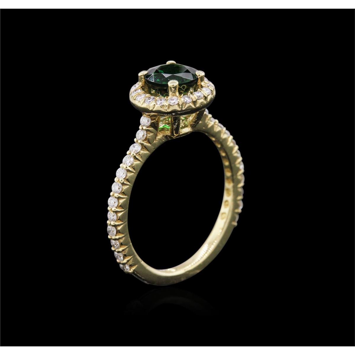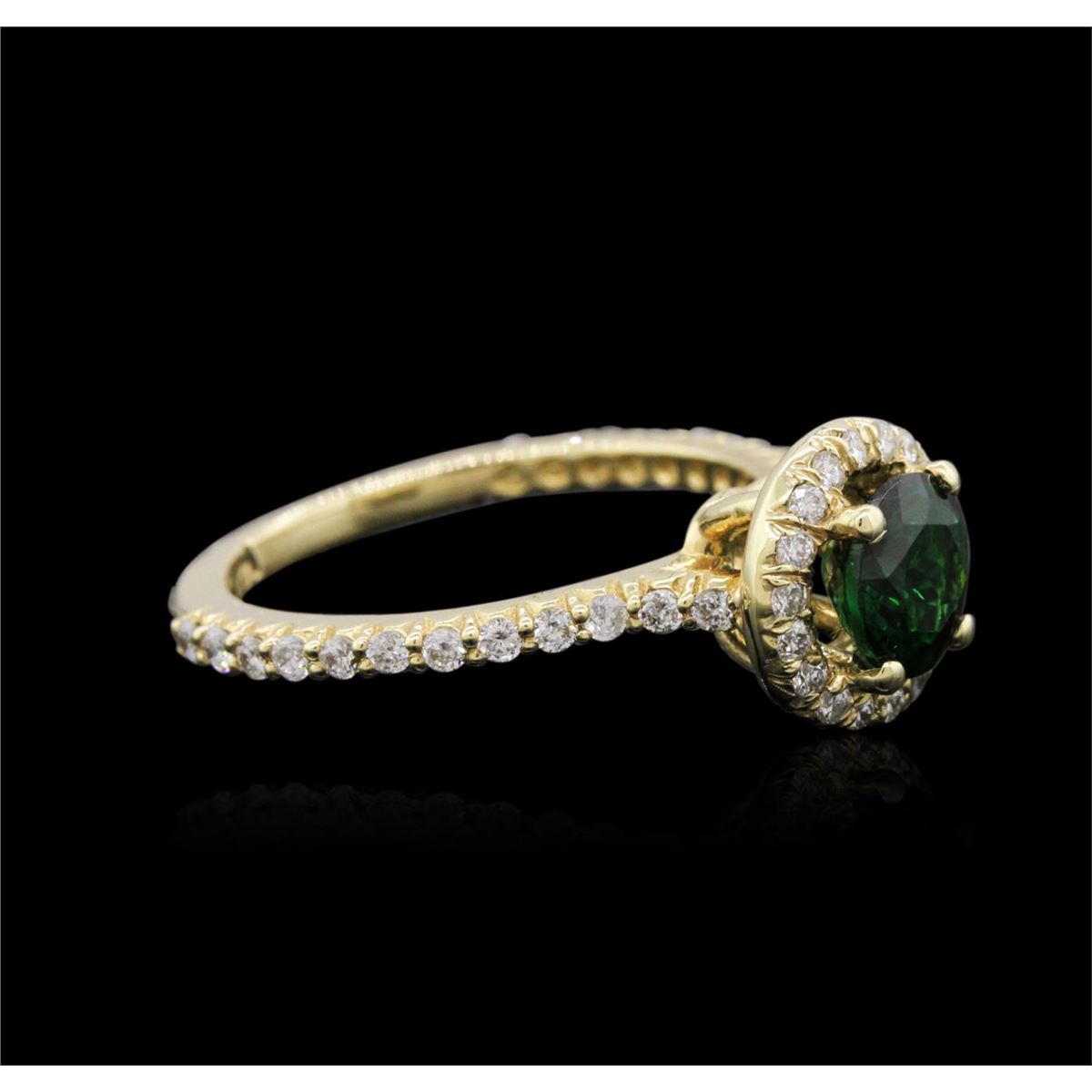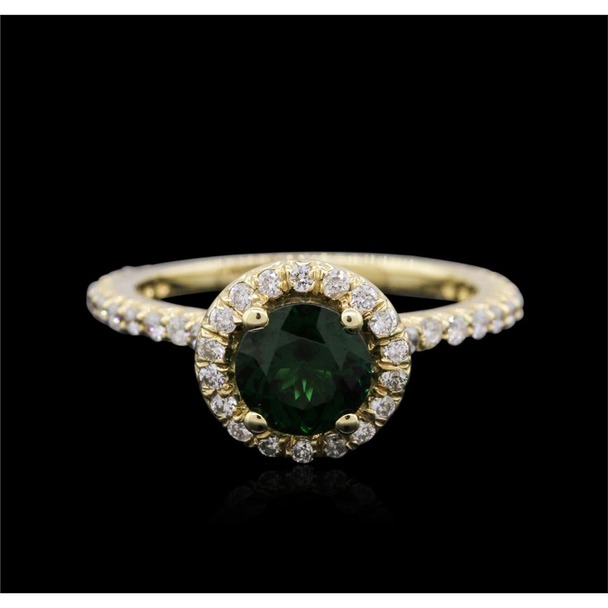 One electronically tested 14KT yellow gold ladies combination cast & assembled garnet and diamond ring with a cathedral shank with a bright polish finish. Identified with markings of "14K". Condition is new. Containing: One prong set round modified brilliant cut natural garnet, measuring 6.41 - 6.40 x 4.10 mm, approximate weight of 1.36ct., clarity is eye clean, medium, moderately strong, green color, (GIA G 5/4), cut is good. Forty-Two prong set round brilliant cut diamonds, measuring 1.50 - 1.30 x 0.84mm (depth est.) approximate total weight of 42 Stones = 0.42ct. Clarity: I-1 to I-2. Color: I - J, Cut is Good. All diamonds and colored gemstones are graded in the mounting, unless otherwise stated. Colored gemstones are presumed to have been subjected to commonly used enhancement processes. Total Weight of Colored Stones 1.36ct. Total Weight of Diamonds 0.42ct. Total Weight of Ring 3.80 grams. GGL Appraised at $3,290.00.