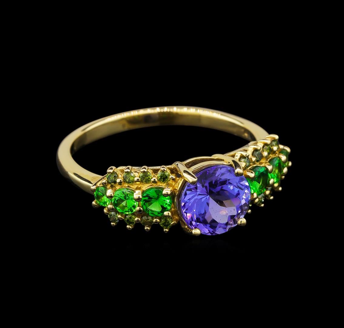 One electronically tested 14KT yellow gold ladies cast tanzanite and garnet ring with a bright polish finish. Identified with markings of "14K". Condition is new. Containing: One prong set round modified brilliant cut natural tanzanite, measuring 6.80 - 6.80 x 4.42 mm, approximate weight of 1.37ct., clarity is eye clean, type I, medium light, very slightly grayish, violet color, (GIA V 4/3), cut is good. Six prong set round modified brilliant cut natural tsavorite garnets, measuring 2.80 - 1.80 x 1.50 mm, approximate total weight of 0.48ct., clarity is slightly included, type II, medium, moderately strong, green color, (GIA G 5/4), cut is good. Sixteen prong set round modified brilliant cut natural diopsides, measuring 1.30 - 1.30 x 0.85 mm, approximate total weight of 0.16ct., clarity is slightly included, medium dark, very slightly grayish, green color, (GIA G 6/3), cut is good. Colored gemstones are presumed to have been subjected to commonly used enhancement processes. All colored gemstones are graded in the mounting, unless otherwise stated. Total Weight of Colored Stones 2.01ct. Total Weight of Ring 2.90 grams. GGL Appraised at $1,840.00.