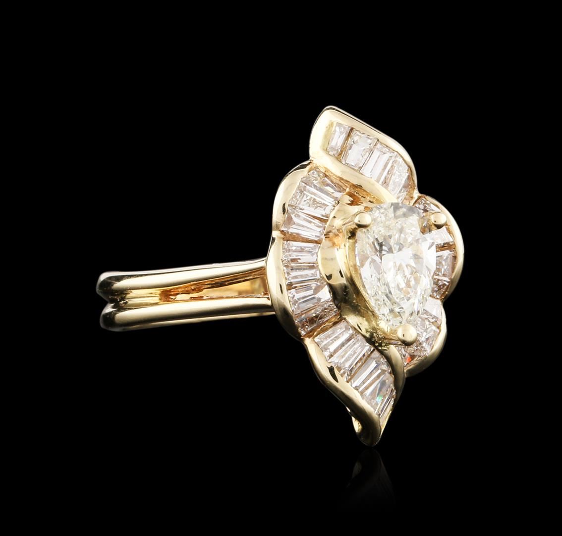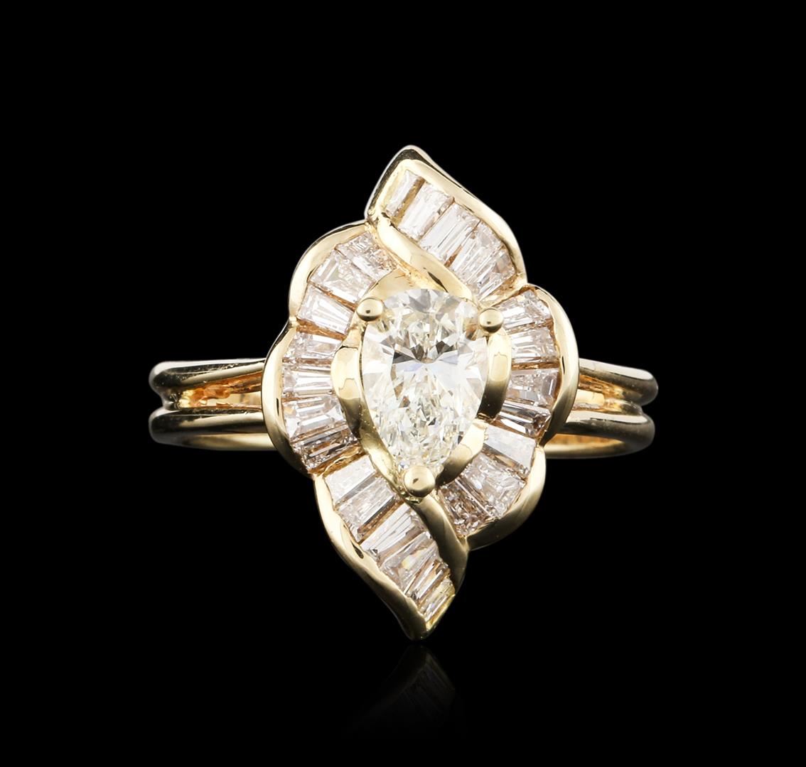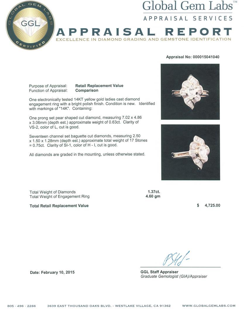 One electronically tested 14KT yellow gold ladies cast diamond engagement ring with a bright polish finish. Identified with markings of "14K". Condition is new. Containing: One prong set pear shaped cut diamond, measuring 7.02 x 4.86 x 3.06mm (depth est.) approximate weight of 0.63ct. Clarity: VS-2. Color: L, Cut is Good. Seventeen channel set baguette cut diamonds, measuring 2.50 x 1.50 x 1.28mm (depth est.) approximate total weight of 17 Stones = 0.75ct. Clarity: SI-1. Color: H - I, Cut is Good. All diamonds are graded in the mounting, unless otherwise stated. Total Weight of Diamonds 1.37ct. Total Weight of Engagement Ring 4.60 grams. GGL Appraised at $4,725.00.
