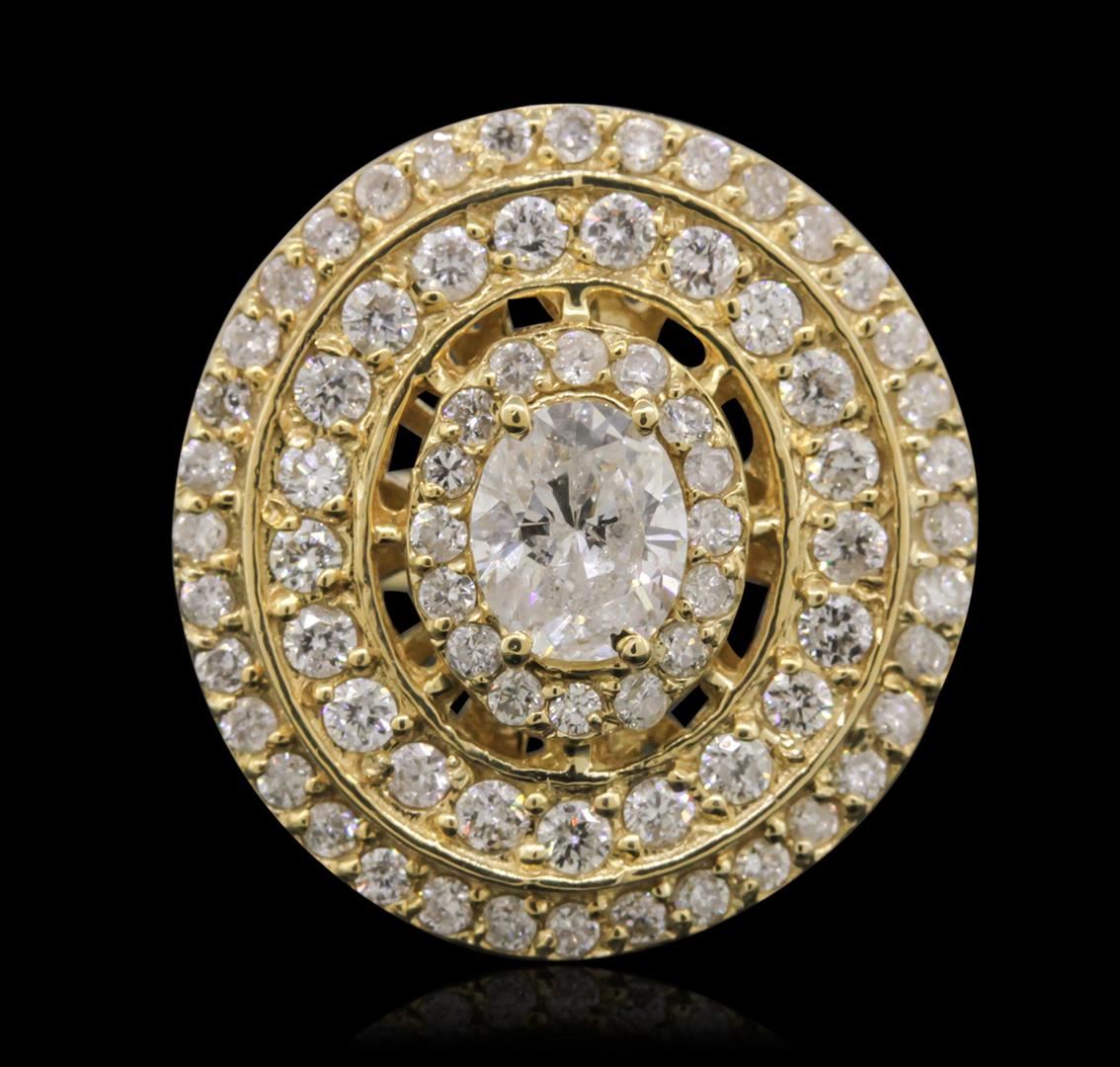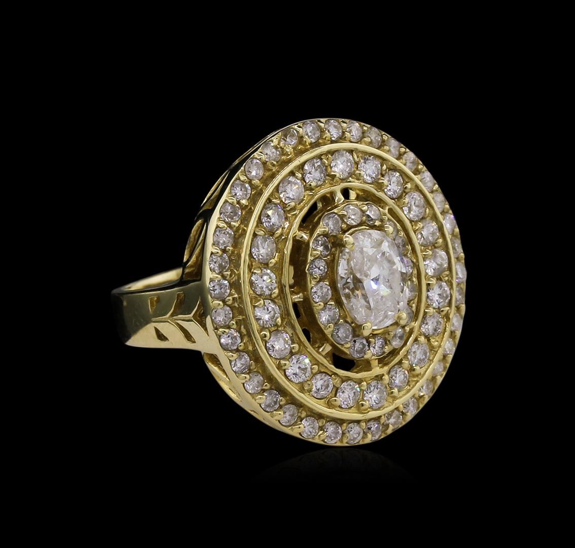 One electronically tested 14KT yellow gold Ladies engagement ring with a bright polish finish. Condition is new. Identified with markings of "K14". Containing: One prong set oval shaped cut diamond, measuring 6.40 x 5.10 x 3.21mm (depth est.) approximate weight of 0.66ct. Clarity: I-2. Color: J, Cut is Good. Seventy-Two prong set round brilliant cut diamonds, measuring 1.50 - 1.30 x 0.84mm (depth est.) approximate. Total Weight of 72 Stones = 0.72ct. Clarity: I-1 to I-2. Color: I - J, Cut is Good. Total Weight of Diamonds 1.38ct. Total Weight of Ring 7.20 grams. GGL Appraised at $6,335.00.