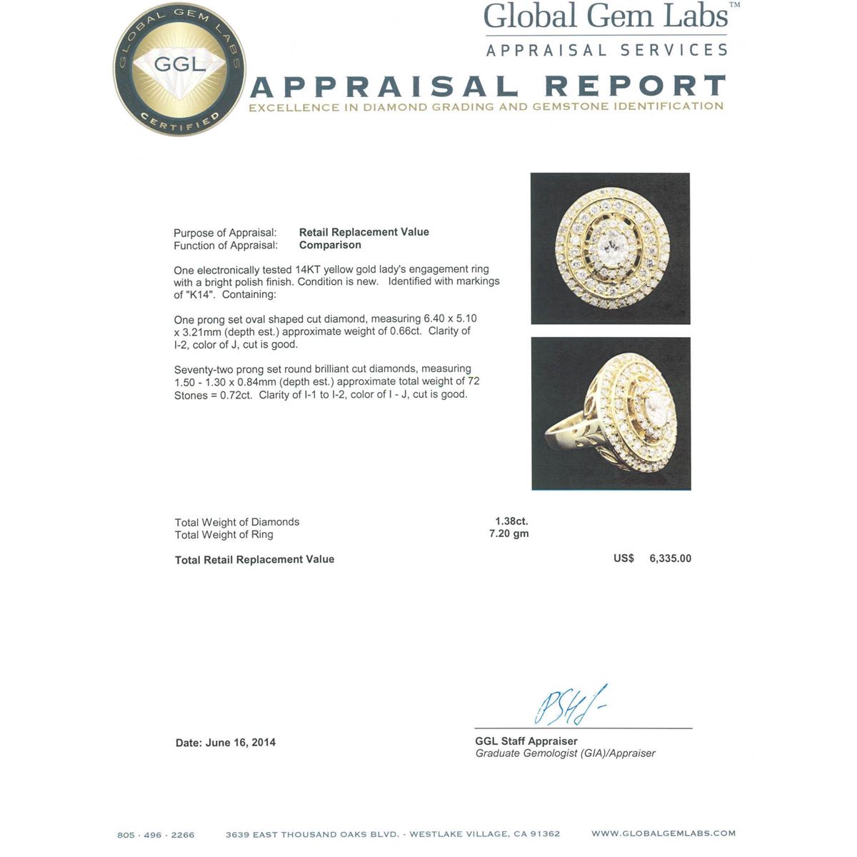 One electronically tested 14KT yellow gold Ladies engagement ring with a bright polish finish. Condition is new. Identified with markings of "K14". Containing: One prong set oval shaped cut diamond, measuring 6.40 x 5.10 x 3.21mm (depth est.) approximate weight of 0.66ct. Clarity: I-2. Color: J, Cut is Good. Seventy-Two prong set round brilliant cut diamonds, measuring 1.50 - 1.30 x 0.84mm (depth est.) approximate. Total Weight of 72 Stones = 0.72ct. Clarity: I-1 to I-2. Color: I - J, Cut is Good. Total Weight of Diamonds 1.38ct. Total Weight of Ring 7.20 grams. GGL Appraised at $6,335.00.