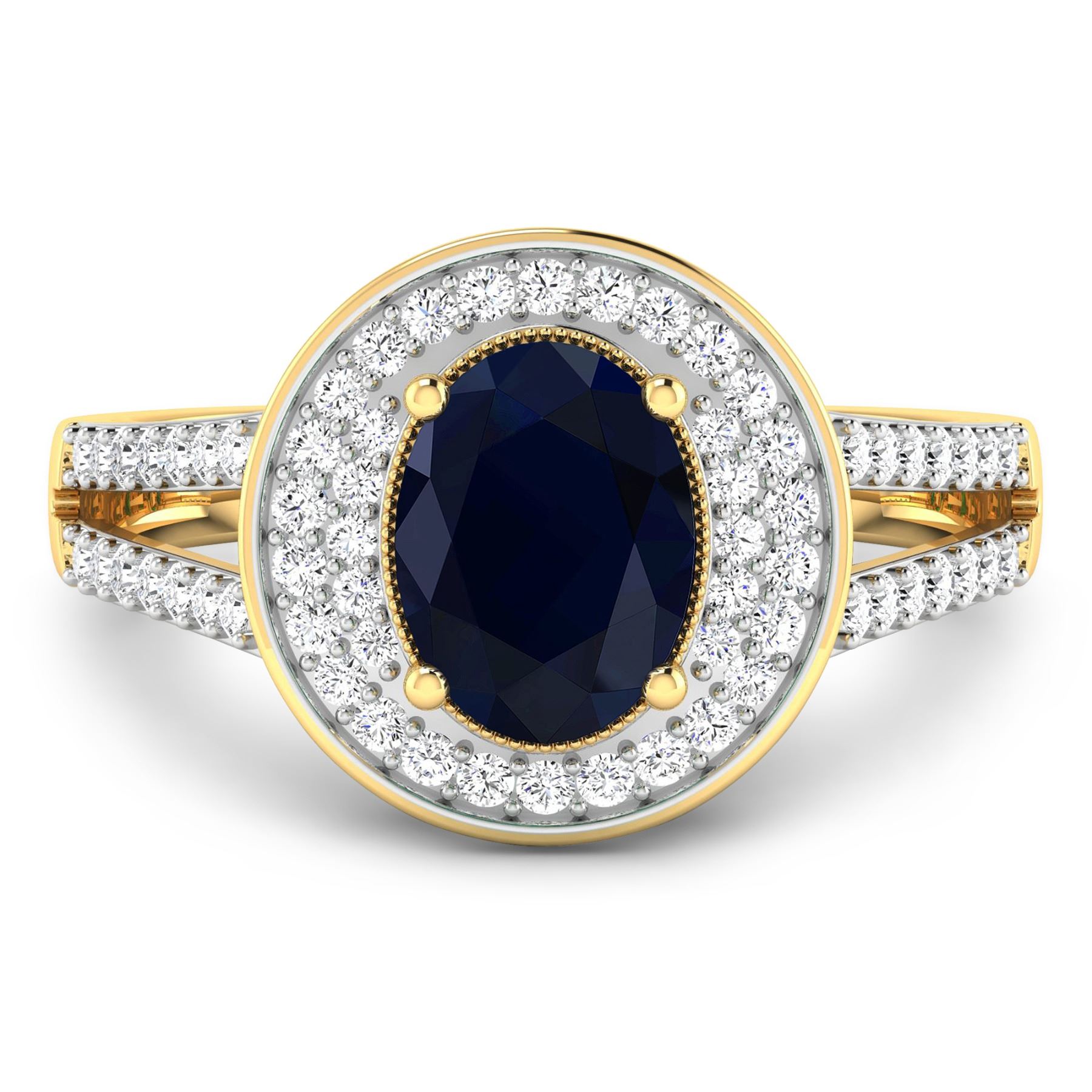 Blue Sapphire (AA) Oval 8x6mm - 1Pc + White Diamond F/C Round 1.10mm - 24Pcs + White Diamond F/C Round 1.00mm - 40Pcs ( White Pan Rhodium ) ( I1-I2/I color ) Total weight of gemstone is 1.3cts. Total Diamond weight is 0.34cts. Total weight of this ring is 3 grams. Ring size 7.