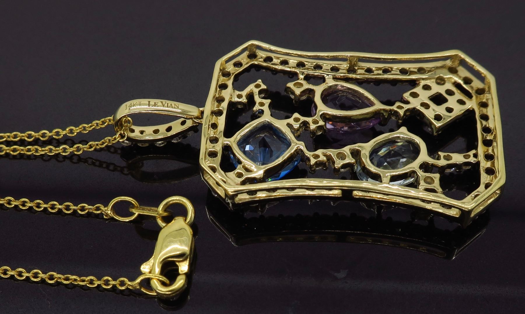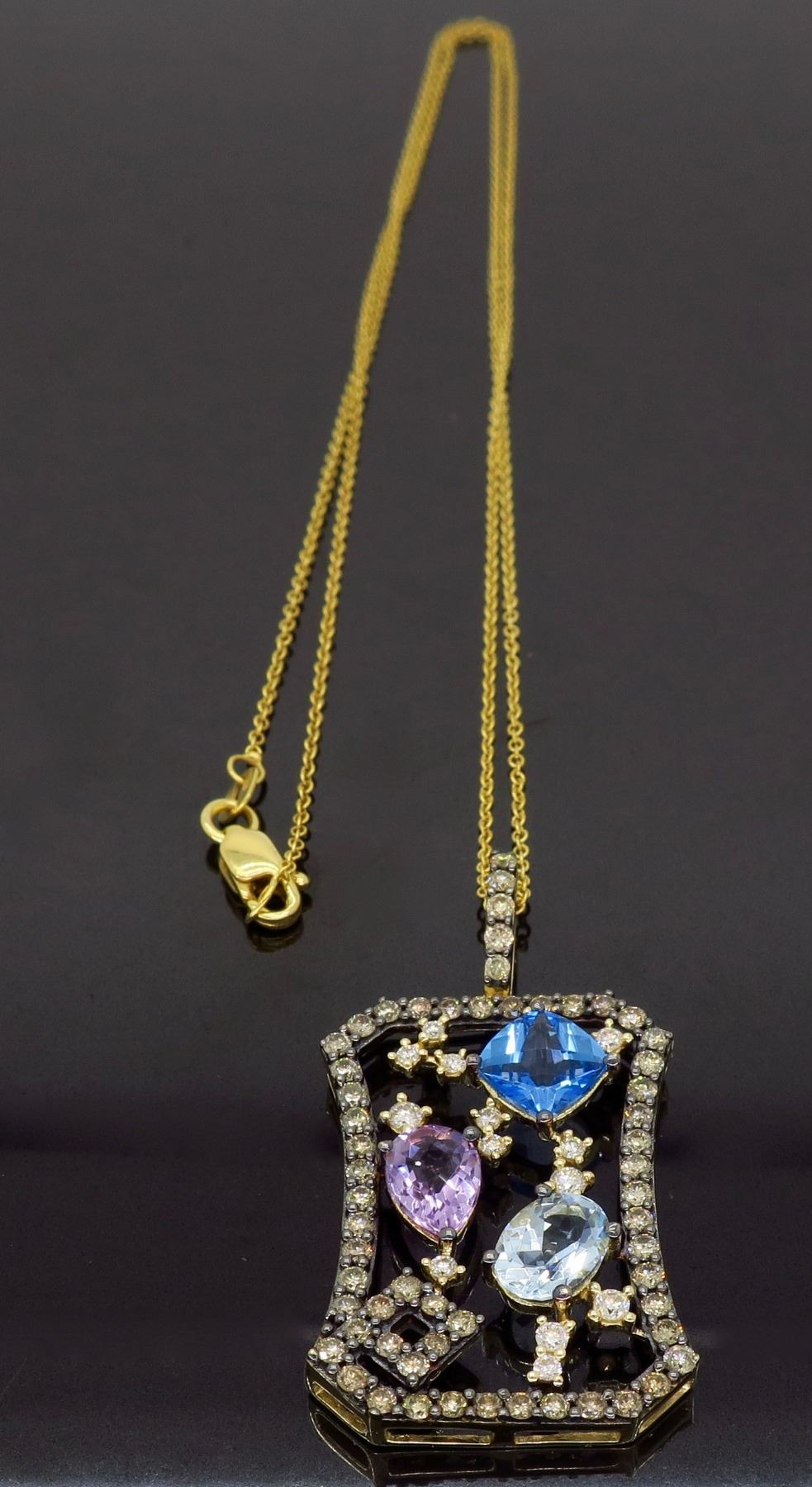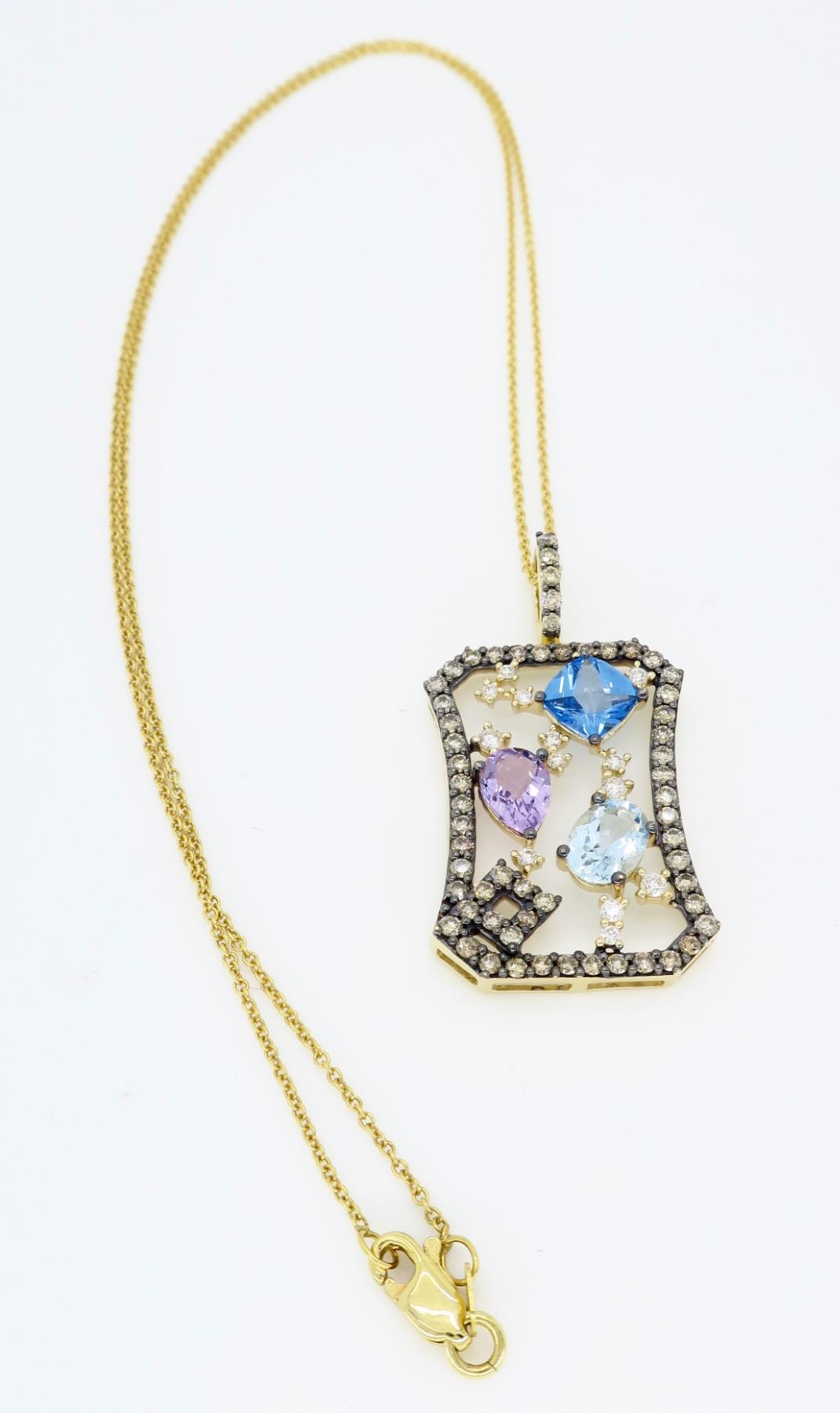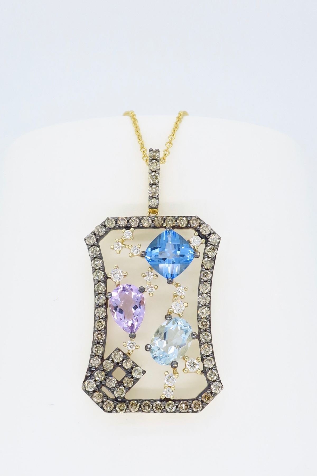 One 14KT Yellow Gold 1.40ctw Levian Chocolate Diamond Pendant with Chain. (58) Chocolate Diamonds and 13 white round diamonds with a total weight of 1.40cts with a color of G-I and clarity of SI-2. Cushion Shaped Topaz, Oval Shaped Aquamarine and Pear Shaped Amethyst. Total weight of this pendant is 6.0 grams. Chain is 18 inches long.