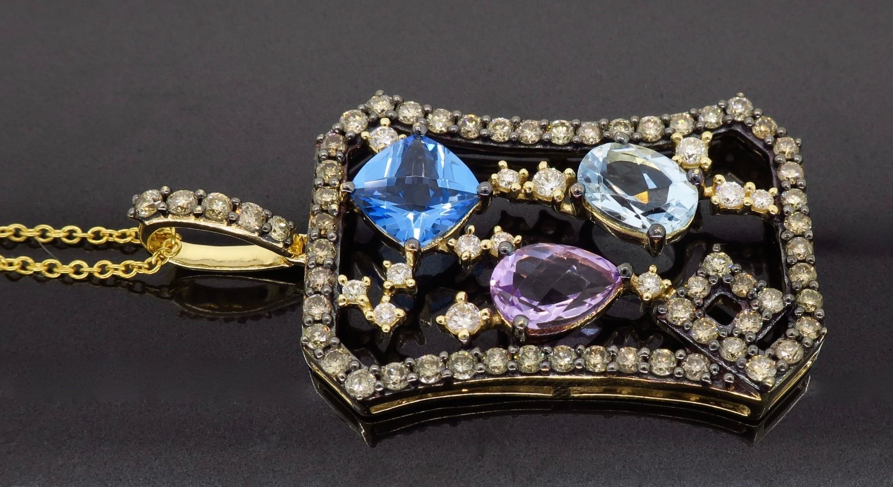 One 14KT Yellow Gold 1.40ctw Levian Chocolate Diamond Pendant with Chain. (58) Chocolate Diamonds and 13 white round diamonds with a total weight of 1.40cts with a color of G-I and clarity of SI-2. Cushion Shaped Topaz, Oval Shaped Aquamarine and Pear Shaped Amethyst. Total weight of this pendant is 6.0 grams. Chain is 18 inches long.