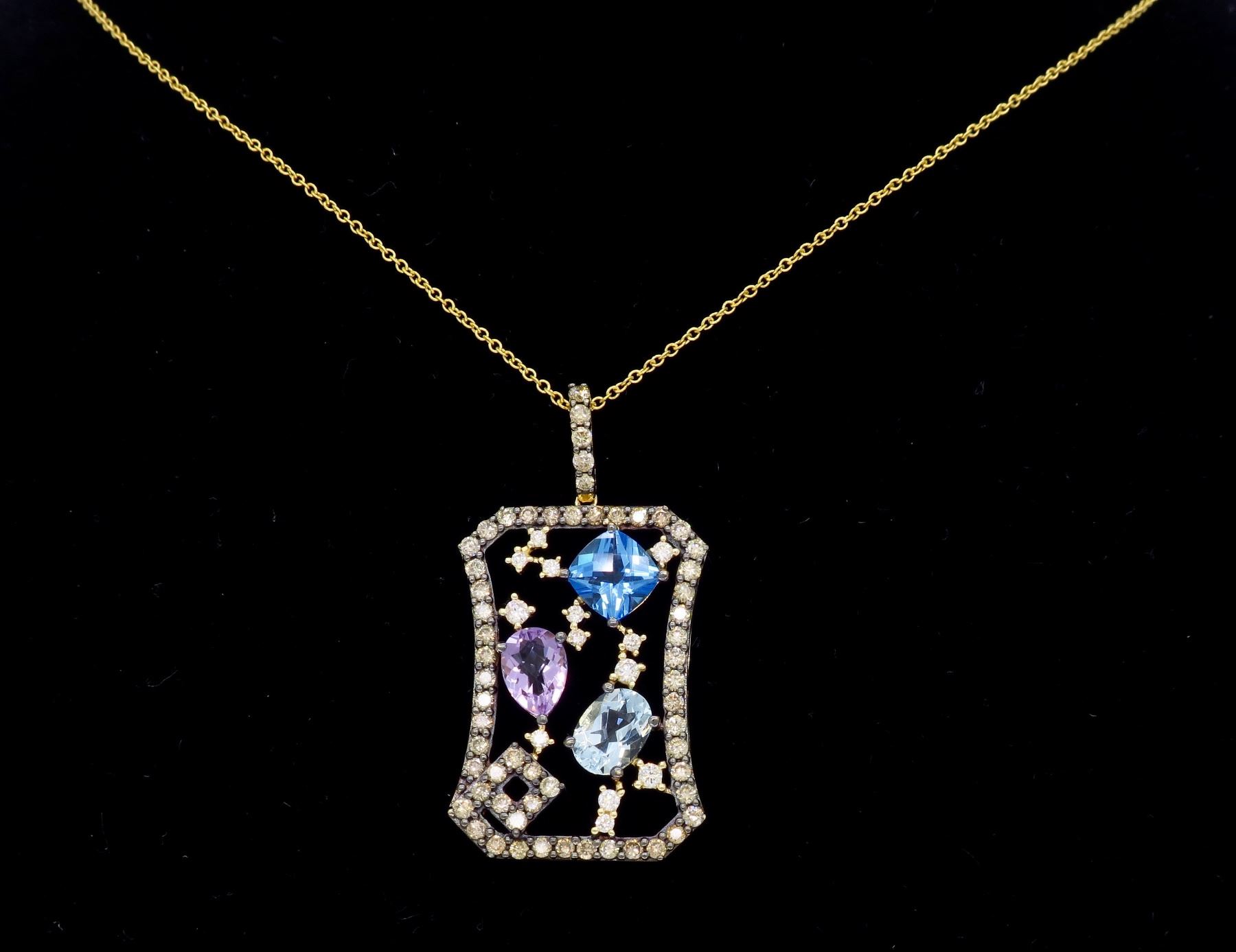 One 14KT Yellow Gold 1.40ctw Levian Chocolate Diamond Pendant with Chain. (58) Chocolate Diamonds and 13 white round diamonds with a total weight of 1.40cts with a color of G-I and clarity of SI-2. Cushion Shaped Topaz, Oval Shaped Aquamarine and Pear Shaped Amethyst. Total weight of this pendant is 6.0 grams. Chain is 18 inches long.