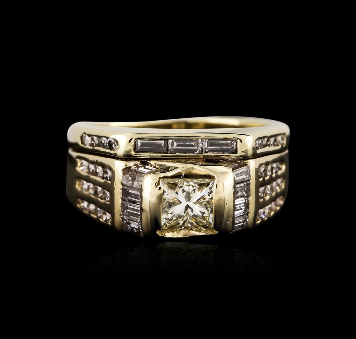 One electronically tested 14KT yellow gold ladies cast diamond engagement ring with a bright polish finish. Identified with markings of "14K". Condition is very good. Containing: One tension set princess cut diamond, measuring 5.00. x 4.50 x 3.38mm (depth est.) approximate weight of 0.62ct. Clarity: SI-1, Cut is Good. Thirty-Two channel set round brilliant cut diamonds, measuring 1.30 - 1.30 x 0.78mm (depth est.) approximate total weight of 32 Stones = 0.26ct. Clarity: I-1 to I-2. Color: J - K, Cut is Good. Ten channel set baguette cut diamonds, measuring 3.00. x 1.50 x 1.28mm (depth est.) approximate total weight of 10 Stones = 0.53ct. Clarity: VS-2 to SI-1. Color: J - K, Cut is Good. All diamonds are graded in the mounting, unless otherwise stated. Total Weight of Diamonds 1.41ct. Total Weight of Engagement Ring 7.40 grams. GGL Appraised at $5,060.00.