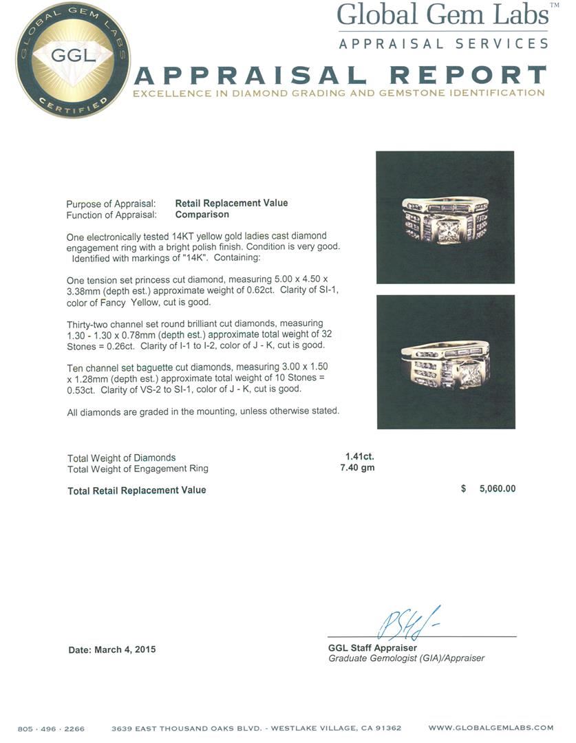 One electronically tested 14KT yellow gold ladies cast diamond engagement ring with a bright polish finish. Identified with markings of "14K". Condition is very good. Containing: One tension set princess cut diamond, measuring 5.00. x 4.50 x 3.38mm (depth est.) approximate weight of 0.62ct. Clarity: SI-1, Cut is Good. Thirty-Two channel set round brilliant cut diamonds, measuring 1.30 - 1.30 x 0.78mm (depth est.) approximate total weight of 32 Stones = 0.26ct. Clarity: I-1 to I-2. Color: J - K, Cut is Good. Ten channel set baguette cut diamonds, measuring 3.00. x 1.50 x 1.28mm (depth est.) approximate total weight of 10 Stones = 0.53ct. Clarity: VS-2 to SI-1. Color: J - K, Cut is Good. All diamonds are graded in the mounting, unless otherwise stated. Total Weight of Diamonds 1.41ct. Total Weight of Engagement Ring 7.40 grams. GGL Appraised at $5,060.00.