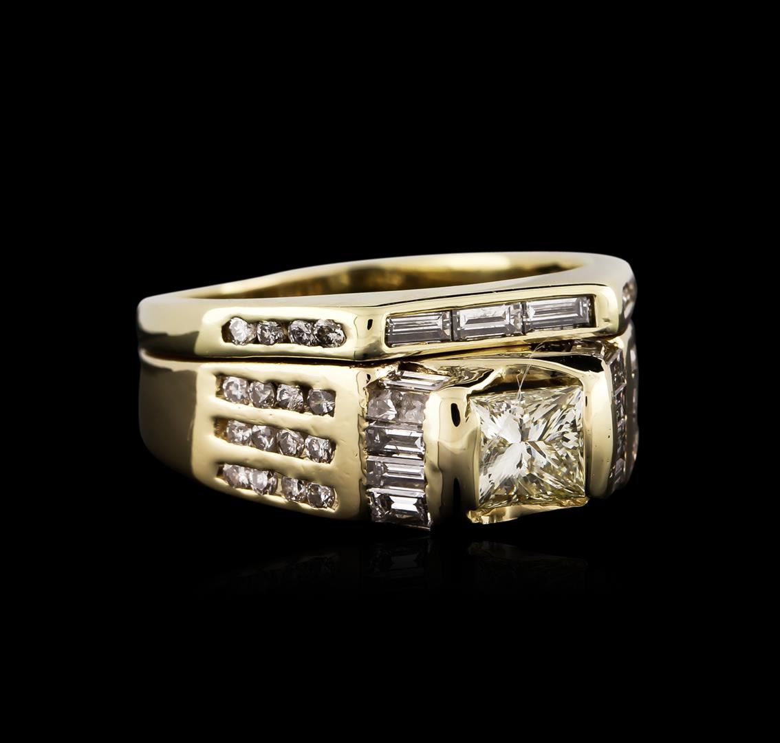 One electronically tested 14KT yellow gold ladies cast diamond engagement ring with a bright polish finish. Identified with markings of "14K". Condition is very good. Containing: One tension set princess cut diamond, measuring 5.00. x 4.50 x 3.38mm (depth est.) approximate weight of 0.62ct. Clarity: SI-1, Cut is Good. Thirty-Two channel set round brilliant cut diamonds, measuring 1.30 - 1.30 x 0.78mm (depth est.) approximate total weight of 32 Stones = 0.26ct. Clarity: I-1 to I-2. Color: J - K, Cut is Good. Ten channel set baguette cut diamonds, measuring 3.00. x 1.50 x 1.28mm (depth est.) approximate total weight of 10 Stones = 0.53ct. Clarity: VS-2 to SI-1. Color: J - K, Cut is Good. All diamonds are graded in the mounting, unless otherwise stated. Total Weight of Diamonds 1.41ct. Total Weight of Engagement Ring 7.40 grams. GGL Appraised at $5,060.00.
