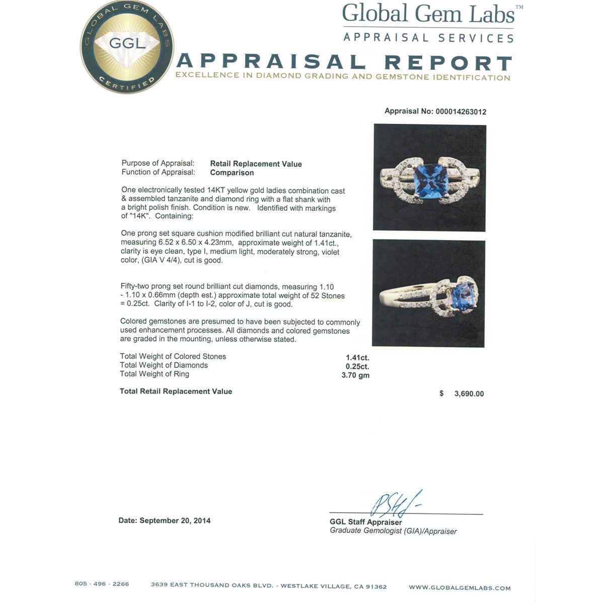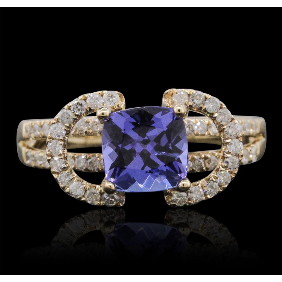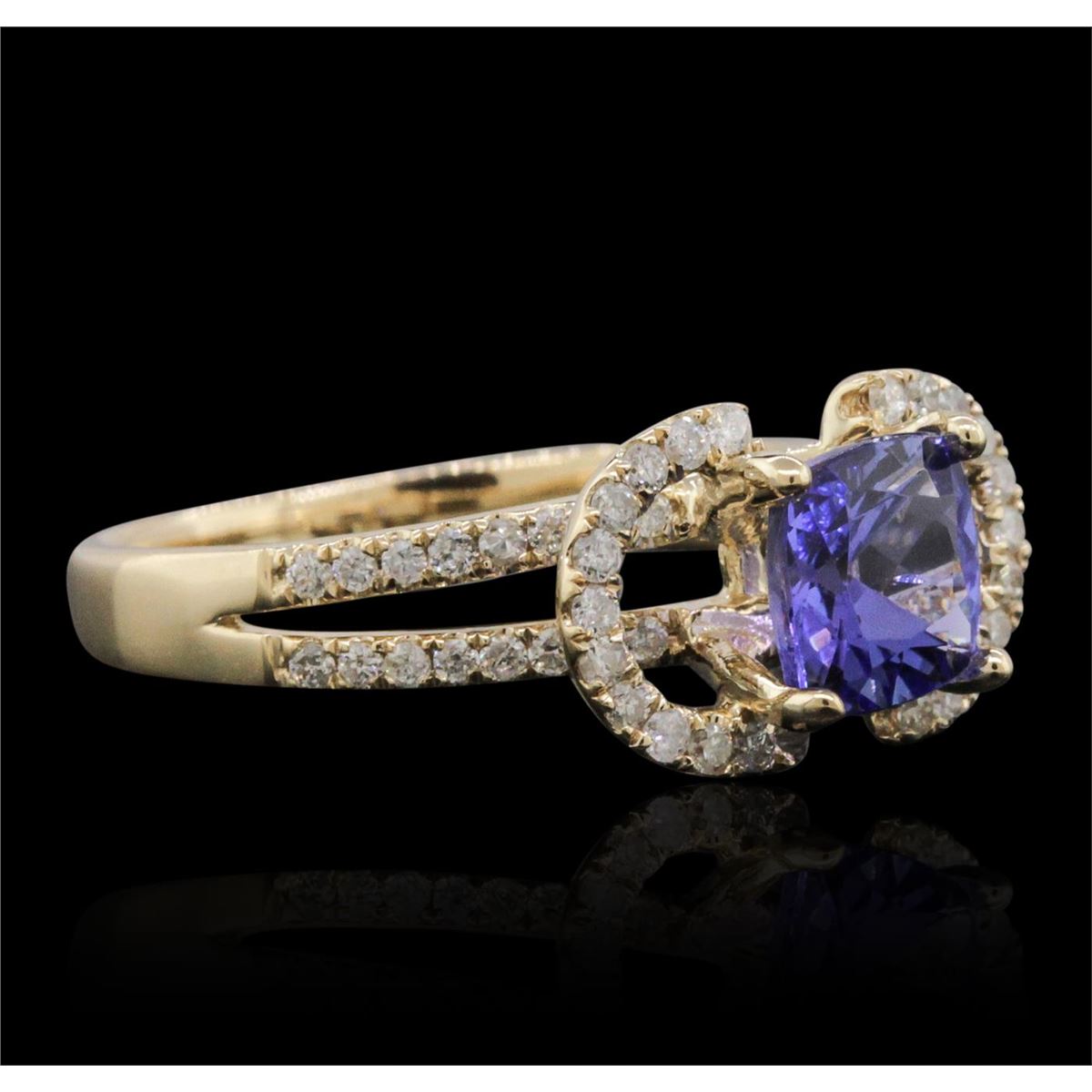 One electronically tested 14KT yellow gold ladies combination cast & assembled tanzanite and diamond ring with a flat shank with a bright polish finish. Identified with markings of "14K". Condition is new. Containing: One prong set square cushion modified brilliant cut natural tanzanite, measuring 6.52 x 6.50 x 4.23mm, approximate weight of 1.41ct., clarity is eye clean, type I, medium light, moderately strong, violet color, (GIA V 4/4), cut is good. Fifty-Two prong set round brilliant cut diamonds, measuring 1.10 - 1.10 x 0.66mm (depth est.) approximate total weight of 52 Stones = 0.25ct. Clarity: I-1 to I-2. Color: J, Cut is Good. Colored gemstones are presumed to have been subjected to commonly used enhancement processes. All diamonds and colored gemstones are graded in the mounting, unless otherwise stated. Total Weight of Colored Stones 1.41ct. Total Weight of Diamonds 0.25ct. Total Weight of Ring 3.70 grams. GGL Appraised at $3,690.00.