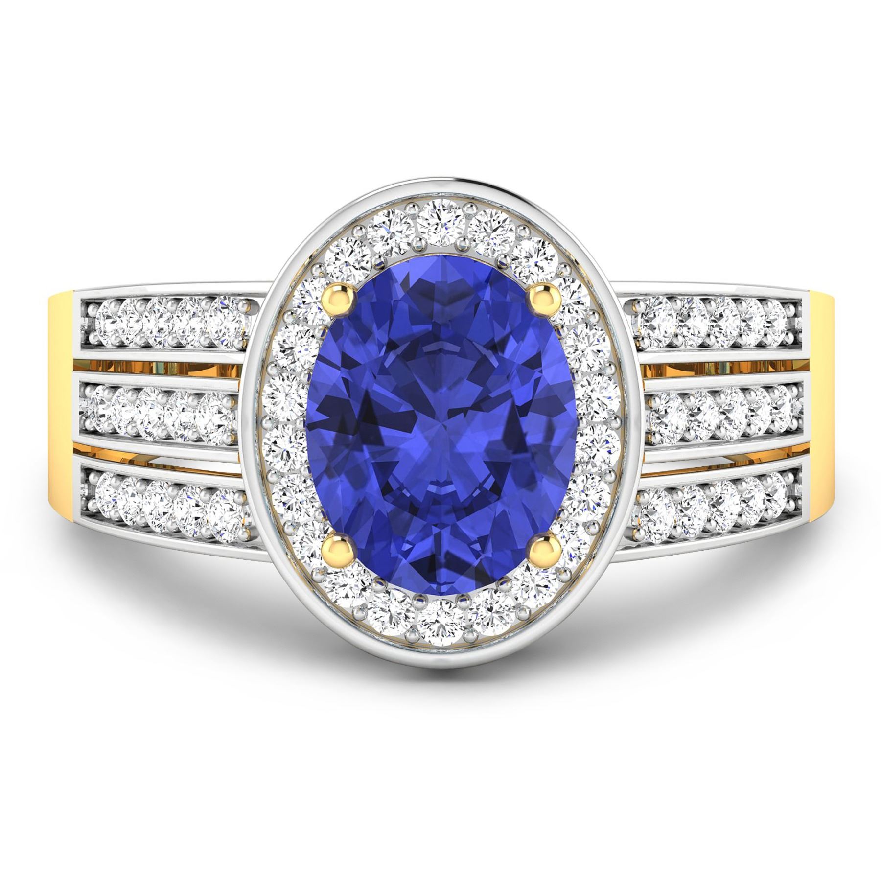 Tanzanite (AA+) Oval 9x7mm - 1Pc + White Diamond F/C Round 1.30mm - 32Pcs + White Diamond F/C Round 1.20mm - 6Pcs + White Diamond F/C Round 1.10mm - 6Pcs + White Diamond F/C Round 1.00mm - 8Pcs ( White Pan Rhodium ) ( SI-2/HI ) Total weight of gemstone is 1.41cts. Total Diamond weight is 0.44cts. Total weight of this ring is 3.59 grams. Ring size 7.