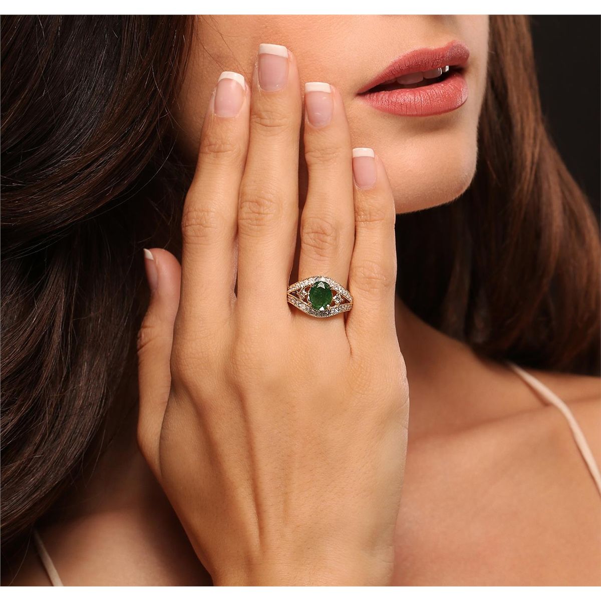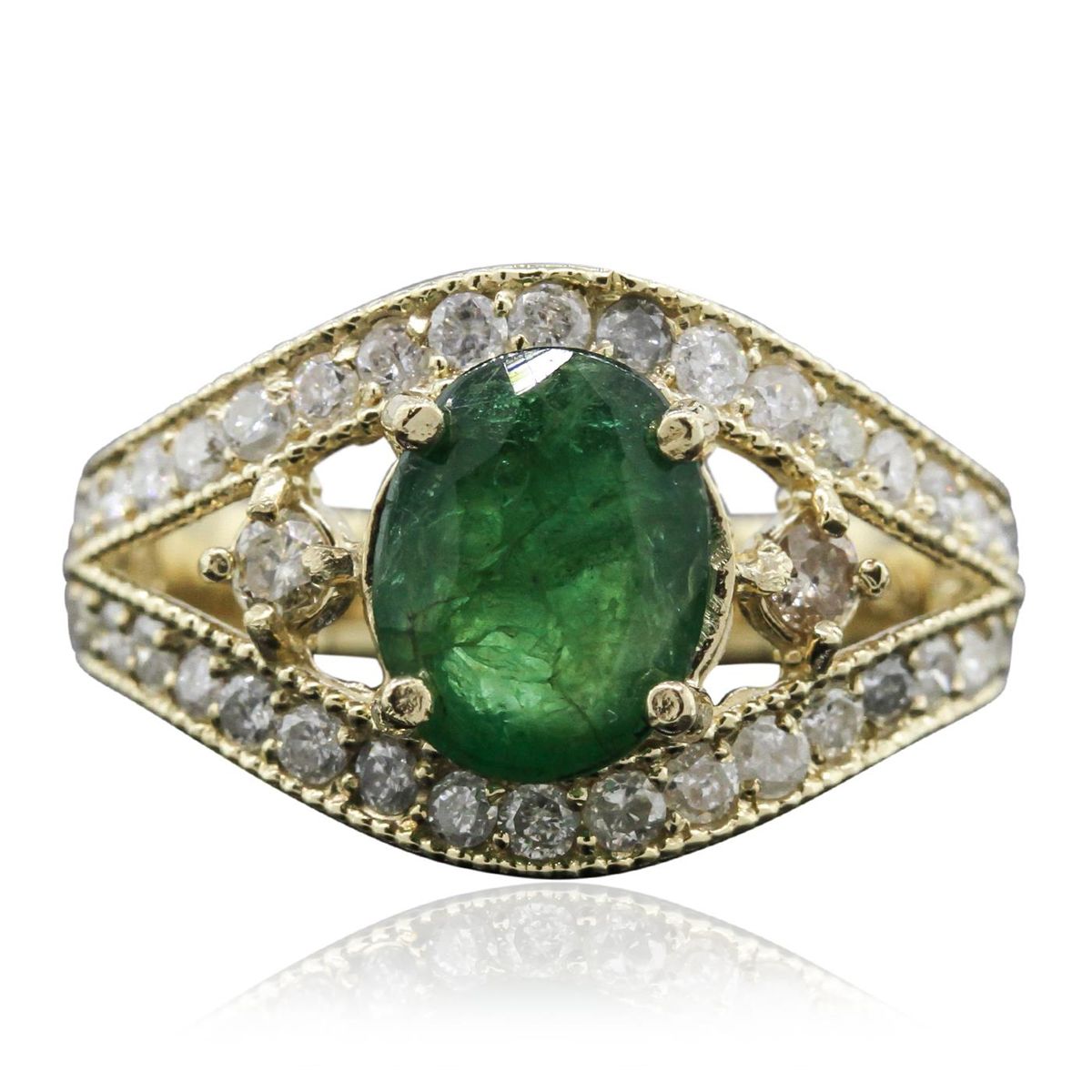 One electronically tested 14KT yellow gold ladies cast emerald and diamond ring. Condition is new, good workmanship. The featured emerald is accented by a single diamond on either side supported by mirroring diamond ribbons, completed by a three millimeter wide band. Bright polish finish with milgrain detailing throughout. Identified with markings of "K14". Containing: One prong set oval mixed cut natural emerald, measuring 9.00 x 7.00 x 3.80mm, 8% bulge factor, approximate weight of 1.43ct, clarity is heavily included, type III, medium dark, moderately strong, very slightly bluish green color, (GIA vslbG 6/4), cut is good. Transmitting light with a minimum of distortion, transparent. Naturally occurring internal & external characteristics are present. Indications of oil residue. Graded in the setting. Two prong set round brilliant cut diamonds, measuring 2.50 - 2.40 x 1.47mm (depth est.) approximate total weight of 2 Stones = 0.13ct. Graded in the setting. Clarity I-1 Color I - J Thirty-Eight bead set round brilliant cut diamonds, measuring 1.70 - 1.60 x 0.99mm (depth est.) approximate total weight of 38 Stones = 0.73ct. Graded in the setting. Clarity I-1 to I-3 Color H - J Total Weight of Colored Stones 1.43ct. Total Weight of Diamonds 0.86ct. Total Weight of Ring 5.70 grams. AIG Appraised at $4,465.00.