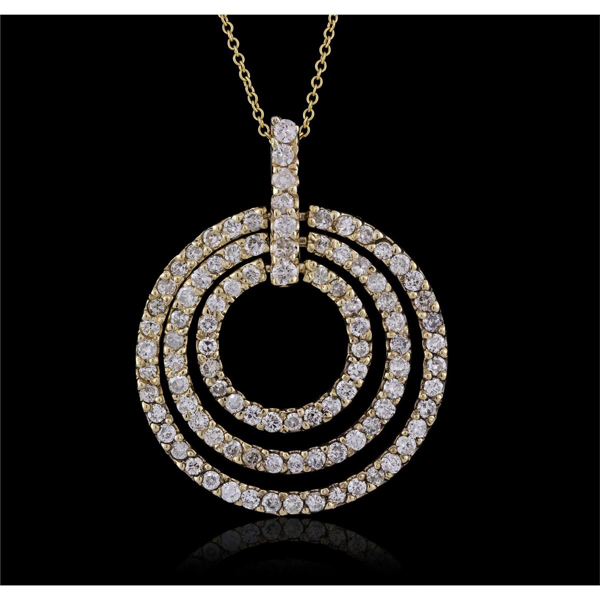One electronically tested 14KT yellow gold Ladies combination cast & assembled pendant & chain 16.0" long, small cable link with a spring ring clasp with a bright polish finish. Condition is new. Identified with markings of "14K". Containing: Ninety-Six prong set round brilliant cut diamonds, measuring 1.60 - 1.60 x 0.96mm (depth est.) approximate. Total Weight of 96 Stones = 1.43ct. Clarity: I-1 to I-3. Color: J - K, Cut is Good. All diamonds are graded in the mounting, unless otherwise stated. Total Weight of Diamonds 1.43ct. Total Weight of Pendant & Chain 8.00 grams.. GGL Appraised at $5,105.00.