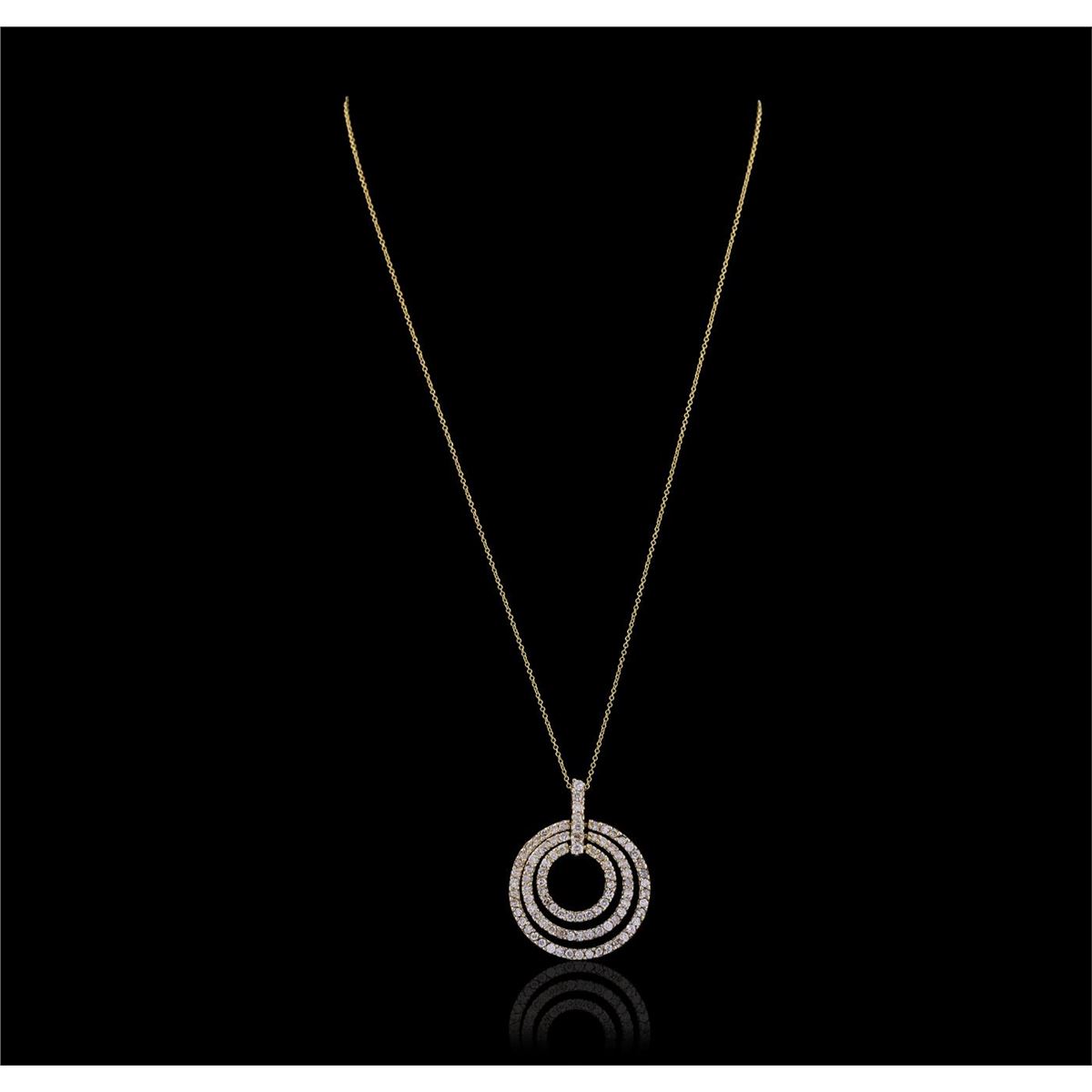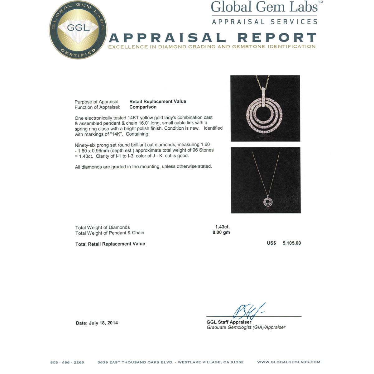 One electronically tested 14KT yellow gold Ladies combination cast & assembled pendant & chain 16.0" long, small cable link with a spring ring clasp with a bright polish finish. Condition is new. Identified with markings of "14K". Containing: Ninety-Six prong set round brilliant cut diamonds, measuring 1.60 - 1.60 x 0.96mm (depth est.) approximate. Total Weight of 96 Stones = 1.43ct. Clarity: I-1 to I-3. Color: J - K, Cut is Good. All diamonds are graded in the mounting, unless otherwise stated. Total Weight of Diamonds 1.43ct. Total Weight of Pendant & Chain 8.00 grams.. GGL Appraised at $5,105.00.