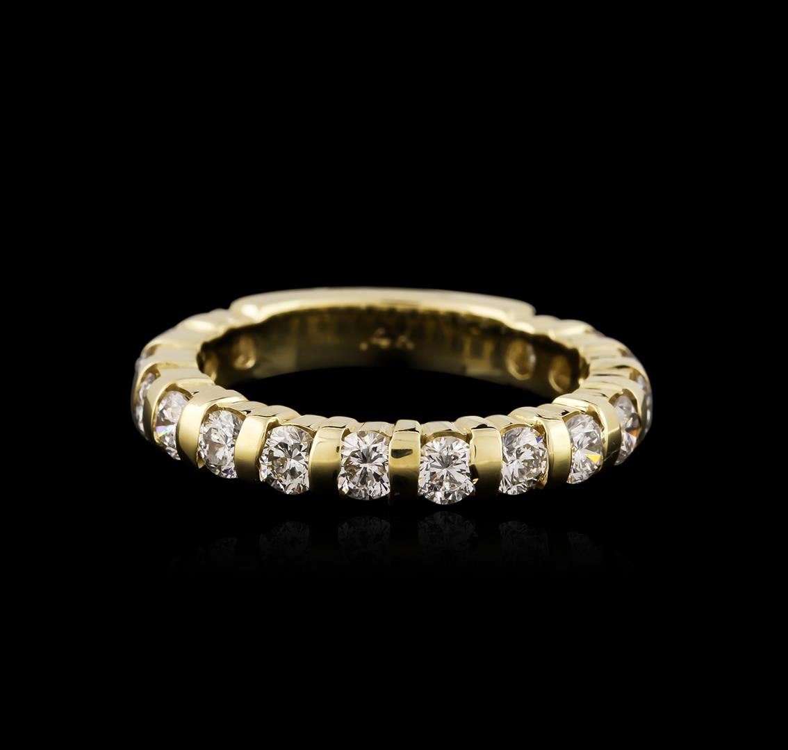 One electronically tested 14KT yellow gold ladies cast diamond wedding band with a bright polish finish. Identified with markings of "14KT". Condition is very good. Containing: Sixteen prong set round brilliant cut diamonds, measuring 2.90 - 2.90 x 1.74mm (depth est.) approximate total weight of 16 Stones = 1.43ct. Clarity: SI-1 to SI-2. Color: G - H, Cut is Good. All diamonds are graded in the mounting, unless otherwise stated. Total Weight of Diamonds 1.43ct. Total Weight of Wedding Band 4.00. grams. GGL Appraised at $3,625.00.