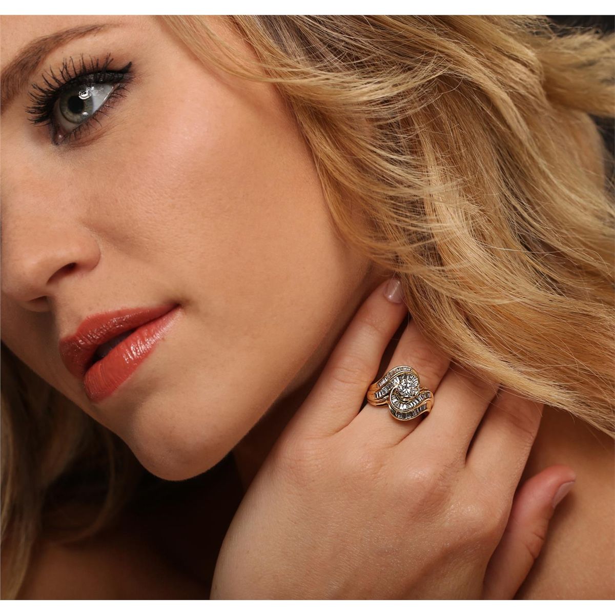 One electronically tested 14KT yellow gold ladies cast & assembled diamond ring with a bright polish finish. The featured diamond is supported by diamond set shoulders and completed by a two and one-half millimeter wide band. Trademark is ZEI. Identified with markings of "14K". Condition is good. Containing: One prong set round brilliant cut diamond, measuring 5.40 - 5.40 x 3.24mm (depth est.) approximate weight of 0.67ct. Graded in the setting. Clarity: I-1 . Color: Depth 60.0%. Table 66.7%. Fifty-Six channel set baguette cut diamonds, measuring from 1.80 x 0.90 x 0.63mm (depth est.) to 2.00 x 1.20 x 0.84mm (depth est.) approximate. Total Weight of 56 Stones = 0.80ct. Graded in the setting. Clarity: VS-1 to SI-1 . Color: F - H. Total Weight of Diamonds 1.47ct. AIG Appraised at $9,485.00.
