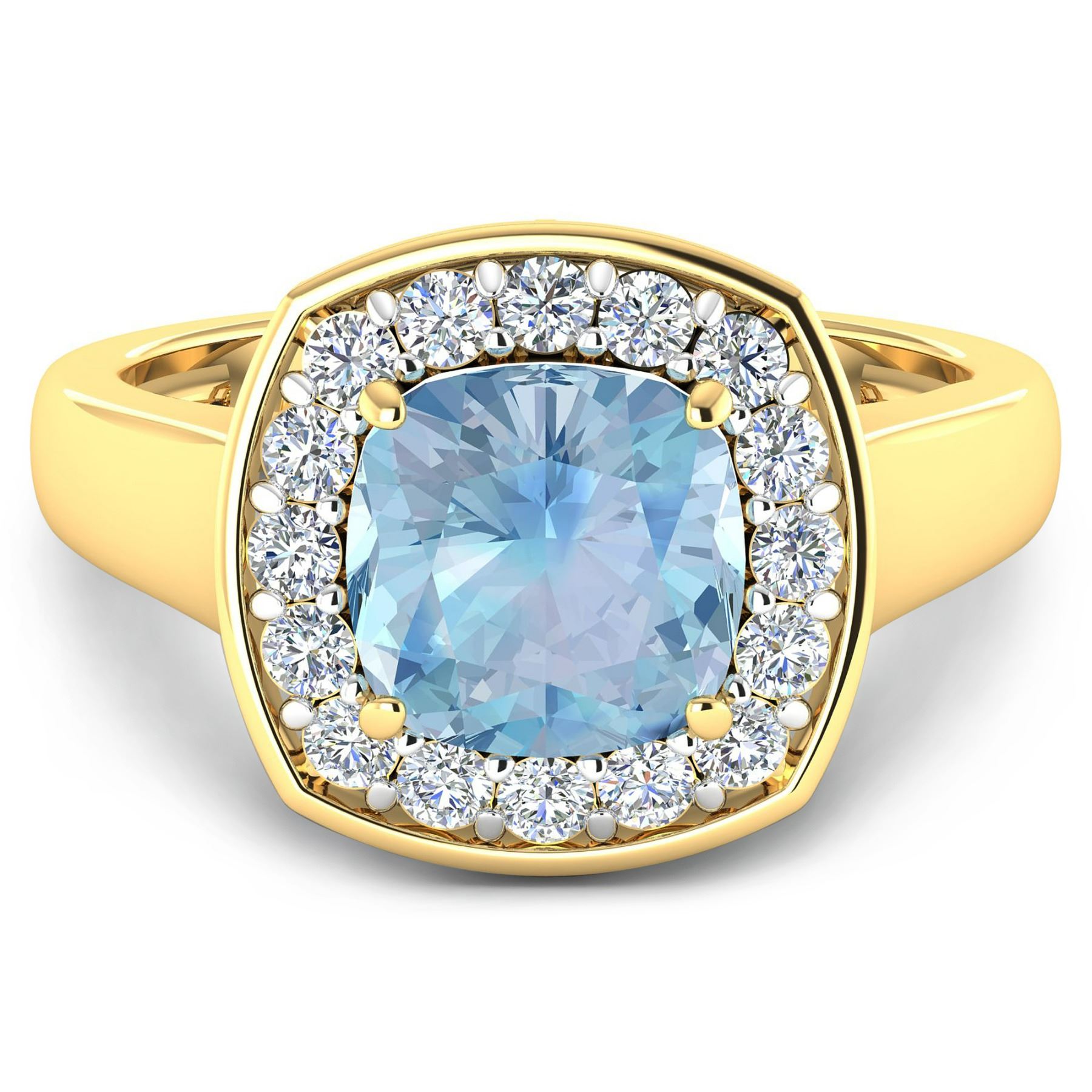 Aquamarine (AA+) Cushion 8.00mm - 1Pc + White Diamond F/C Round 2.00mm - 16Pcs ( White Pan Rhodium ) ( Diamond Quality : SI-2/HI ). Total weight of gemstone is 1.48cts. Total weight of Diamonds is 0.48cts. Total weight of this ring is 4.12 grams. Ring size 7.