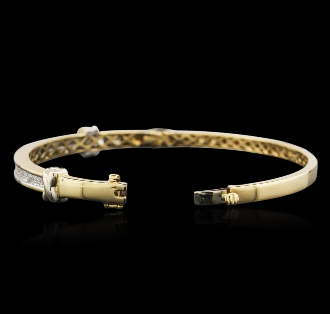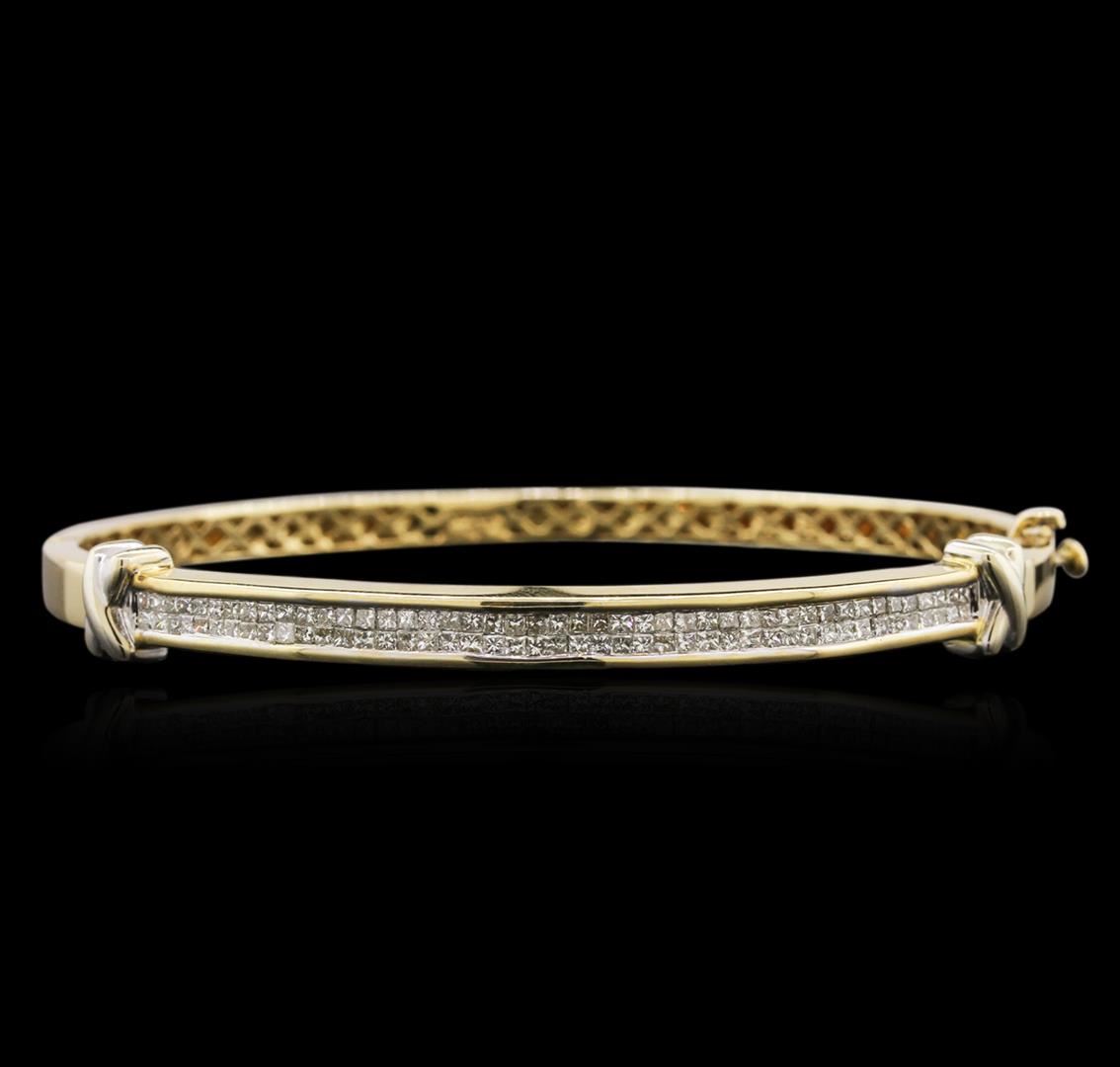 One electronically tested 14KT yellow gold ladies cast diamond bangle bracelet with a hidden box clasp with safety closer with a bright polish finish. Condition is very good. Containing: One Hundred Ten invisible set princess cut diamonds, measuring 1.30 x 1.30 x 0.98mm (depth est.) approximate total weight of 110 Stones = 1.49ct. Clarity: I-1 to I-2. Color: I - J, Cut is Good. All diamonds are graded in the mounting, unless otherwise stated. Total Weight of Diamonds 1.49ct. Total Weight of Bangle Bracelet 17.30 grams. GGL Appraised at $4,685.00.