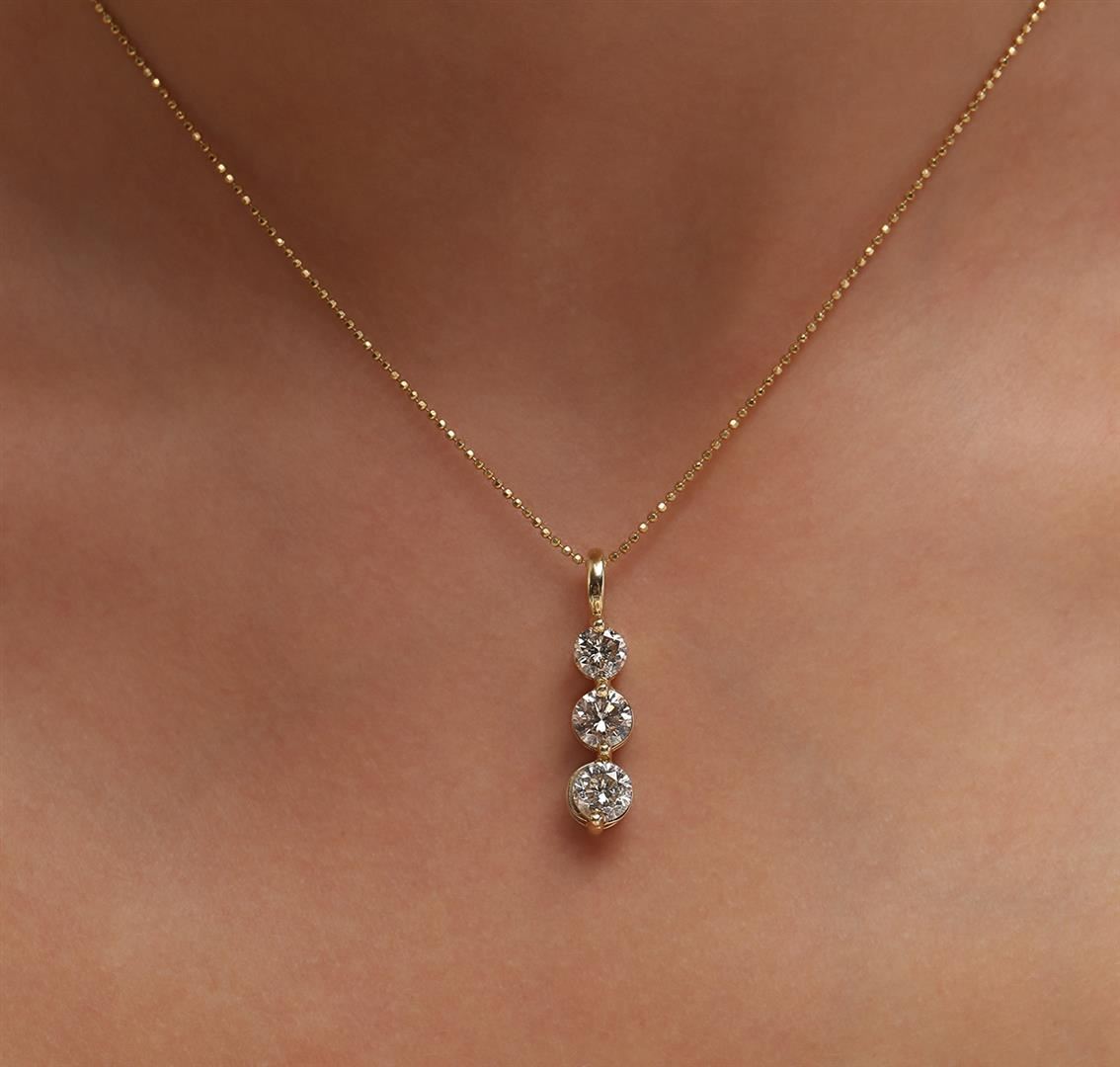 One electronically tested 14KT yellow gold ladies cast diamond pendant & chain 16.0" long, with a lobster claw clasp with a bright polish finish. Identified with markings of "14K". Condition is new. Containing: Three prong set round brilliant cut diamonds, measuring 5.50 - 4.80 x 3.09mm (depth est.) approximate total weight of 3 Stones = 1.50ct. Clarity: I-1, Cut is Good. All diamonds are graded in the mounting, unless otherwise stated. Total Weight of Diamonds 1.50ct. Total Weight of Pendant & Chain 3.90 grams. GGL Appraised at $4,235.00.