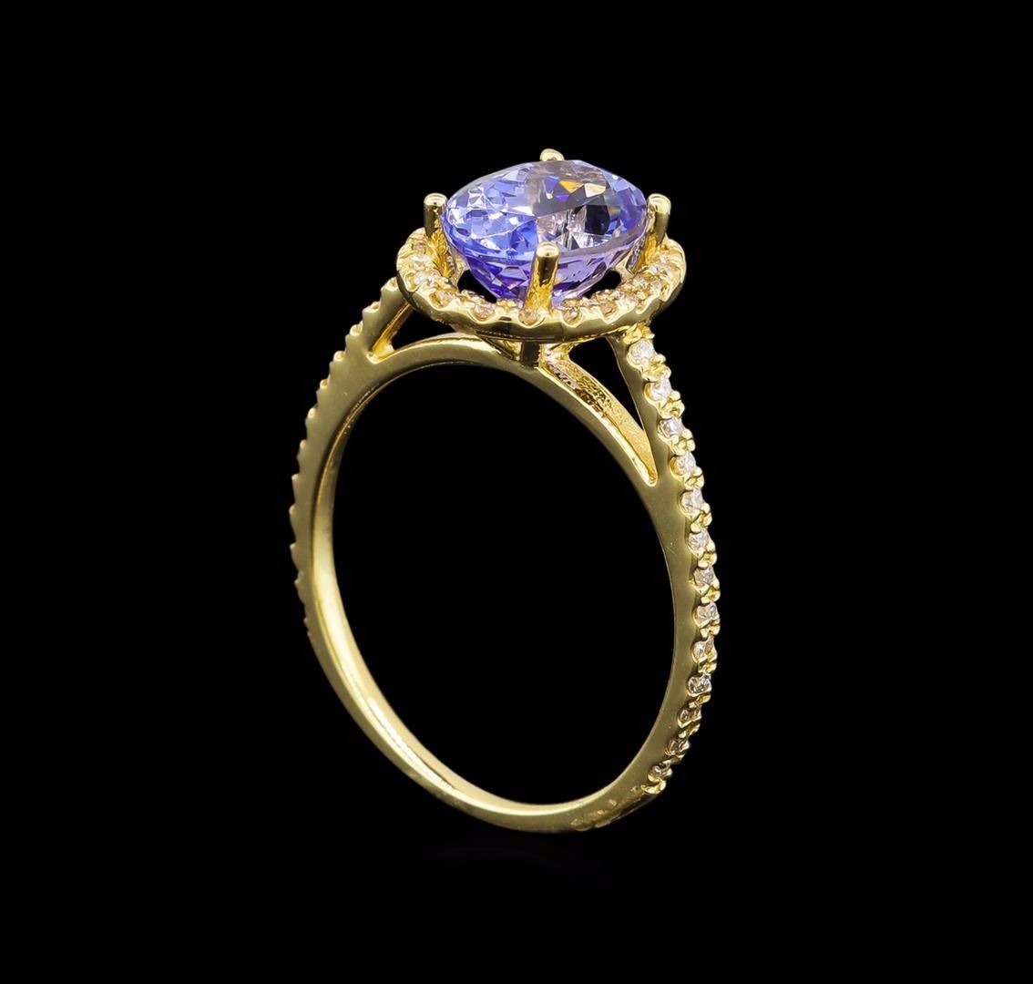 One electronically tested 14KT yellow gold ladies cast tanzanite and diamond ring with a bright polish finish. Identified with markings of "K14". Condition is new. Containing: One prong set oval modified brilliant cut natural tanzanite, measuring 8.80 x 6.80 x 3.57mm, approximate weight of 1.50ct., clarity is eye clean, type I, medium light, very slightly grayish, violet color, (GIA V 4/3), cut is good. Forty-Six prong set round brilliant cut diamonds, measuring 1.20 - 1.10 x 0.69mm (depth est.) approximate total weight of 46 Stones = 0.25ct. Clarity: SI-2 to I-2. Color: I - J, Cut is Good. Colored gemstones are presumed to have been subjected to commonly used enhancement processes. All diamonds and colored gemstones are graded in the mounting, unless otherwise stated. Total Weight of Colored Stones 1.50ct. Total Weight of Diamonds 0.25ct. Total Weight of Ring 2.90 grams. GGL Appraised at $2,435.00.