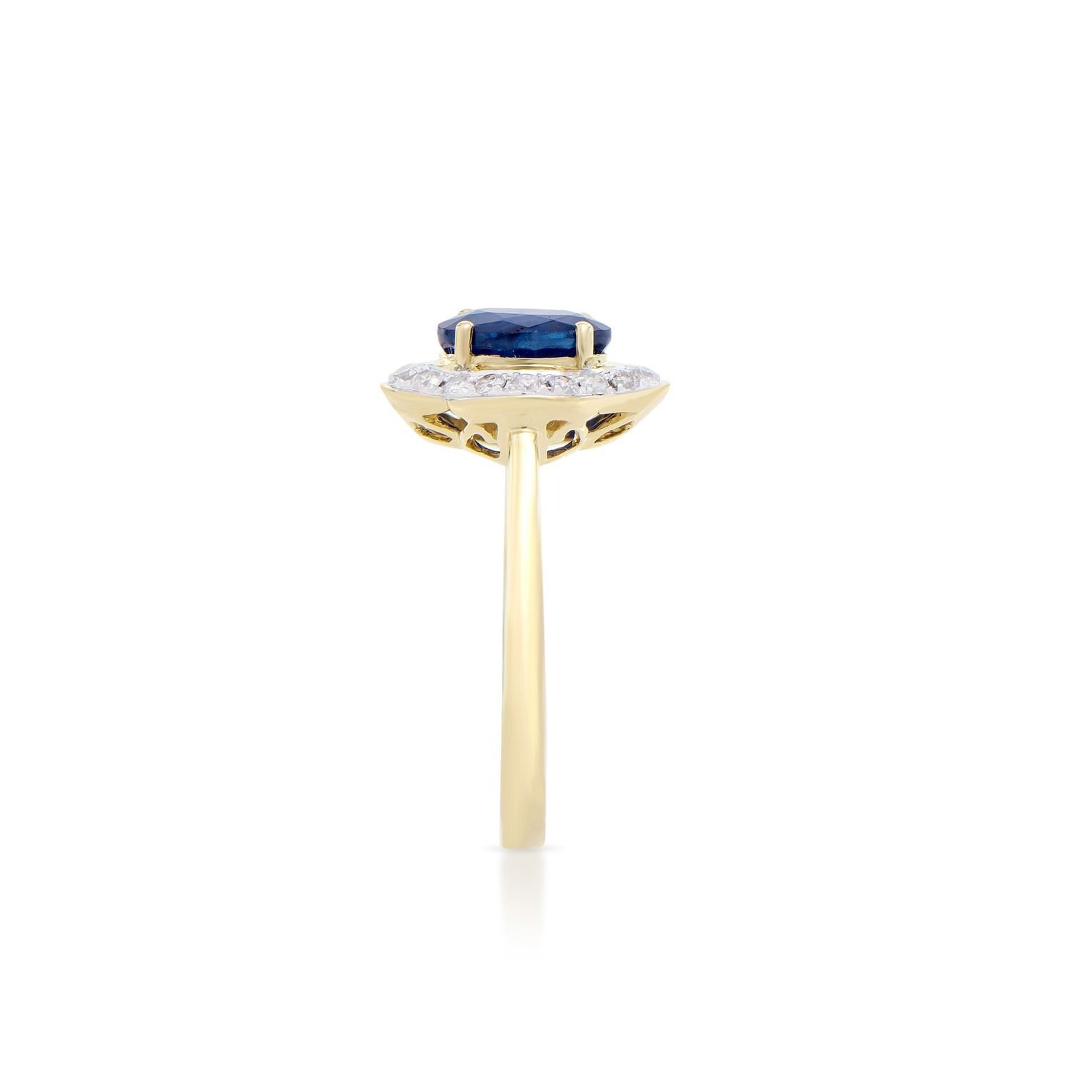 (1) Blue Sapphire with a total weight of 1.50cts. (18) round Diamonds with a total weight of 0.30cts with a color of H-I and clarity of I2-I3. Total weight of the ring is 2.60 grams. Ring size 7.5.