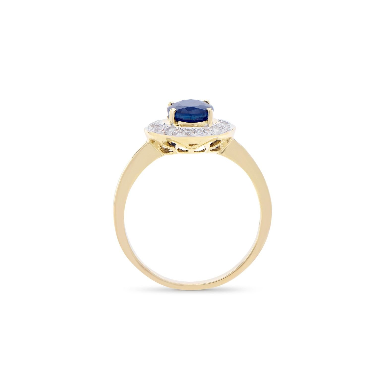 (1) Blue Sapphire with a total weight of 1.50cts. (18) round Diamonds with a total weight of 0.30cts with a color of H-I and clarity of I2-I3. Total weight of the ring is 2.60 grams. Ring size 7.5.