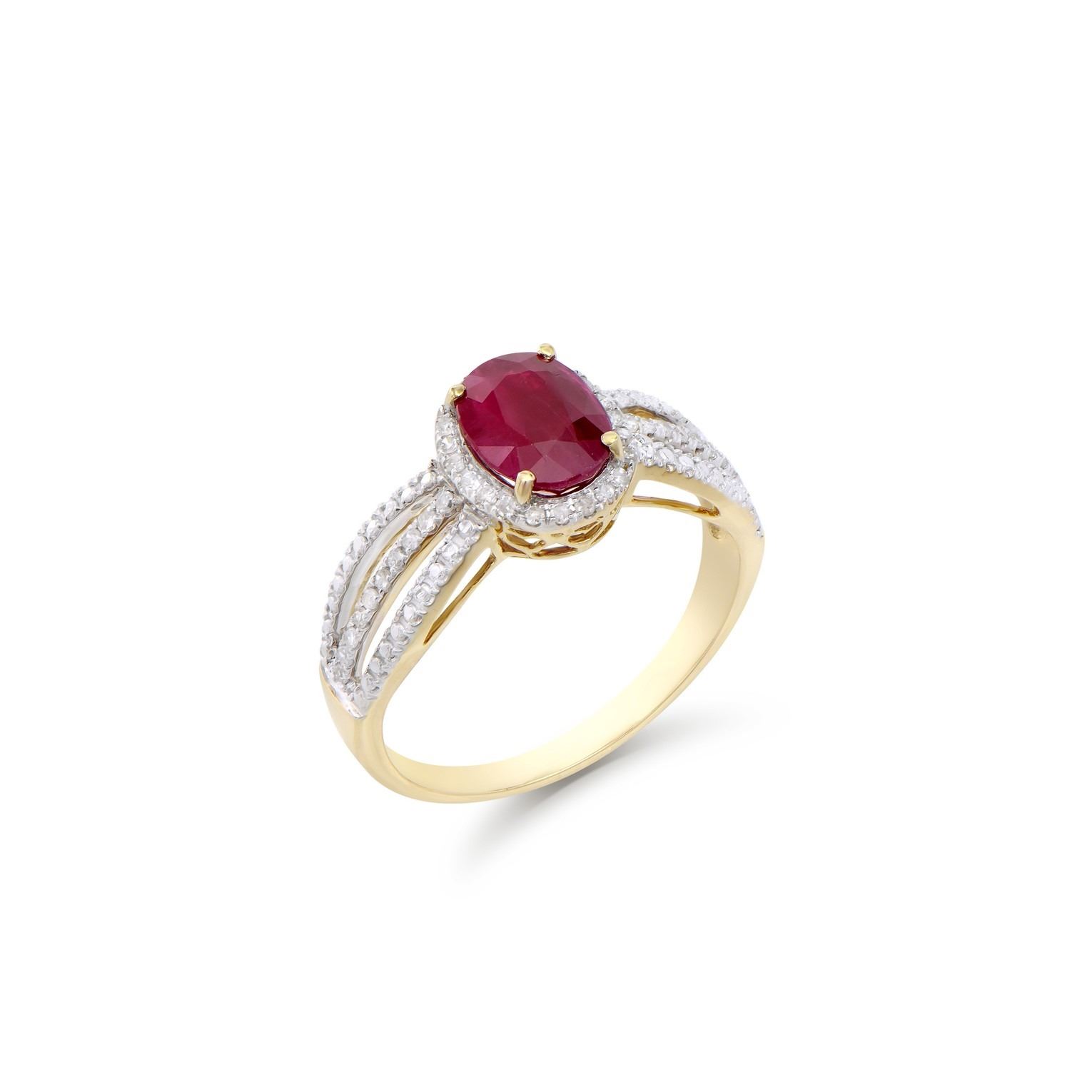 (1) Ruby with a total weight of 1.50cts. (42) round Diamonds with a total weight of 0.18cts with a color of H-I and clarity of I1-I2. Total weight of the ring is 2.50 grams. Ring size 7.5.