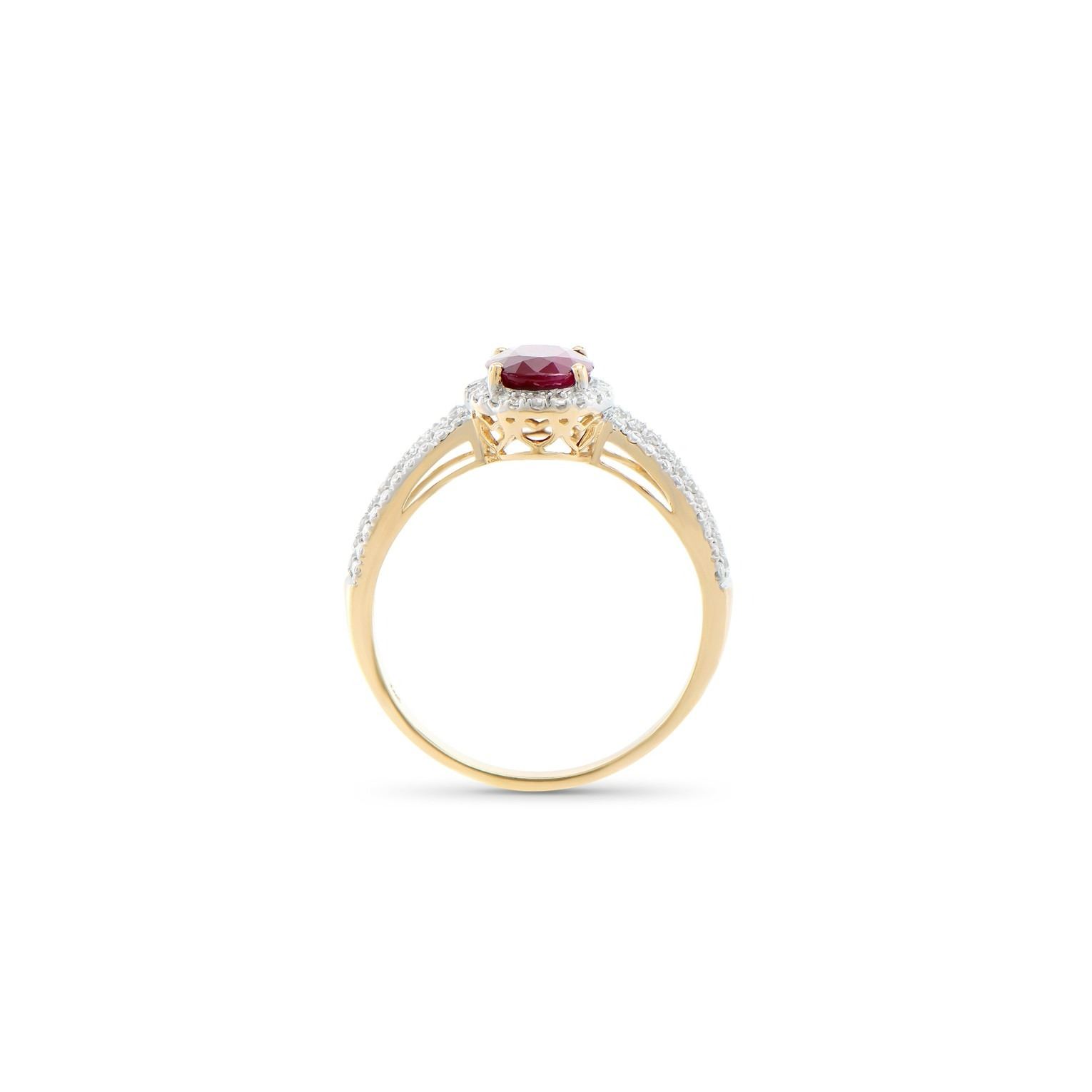 (1) Ruby with a total weight of 1.50cts. (42) round Diamonds with a total weight of 0.18cts with a color of H-I and clarity of I1-I2. Total weight of the ring is 2.50 grams. Ring size 7.5.