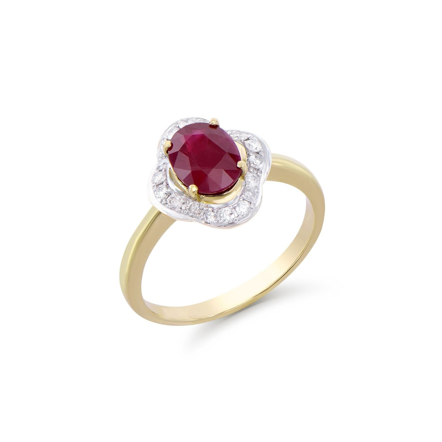 (1) Ruby with a total weight of 1.50cts. (18) round Diamonds with a total weight of 0.30cts with a color of H-I and clarity of I2-I3. Total weight of the ring is 2.60 grams. Ring size 7.5.