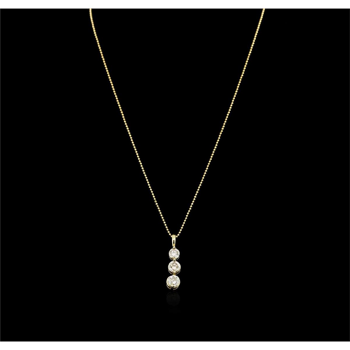 One electronically tested 14KT yellow gold ladies cast diamond pendant & chain 16.0" long, with a lobster claw clasp with a bright polish finish. Identified with markings of "14K". Condition is new. Containing: Three prong set round brilliant cut diamonds, measuring 5.50 - 4.80 x 3.09mm (depth est.) approximate total weight of 3 Stones = 1.50ct. Clarity: I-1, Cut is Good. All diamonds are graded in the mounting, unless otherwise stated. Total Weight of Diamonds 1.50ct. Total Weight of Pendant & Chain 3.90 grams. GGL Appraised at $4,235.00.