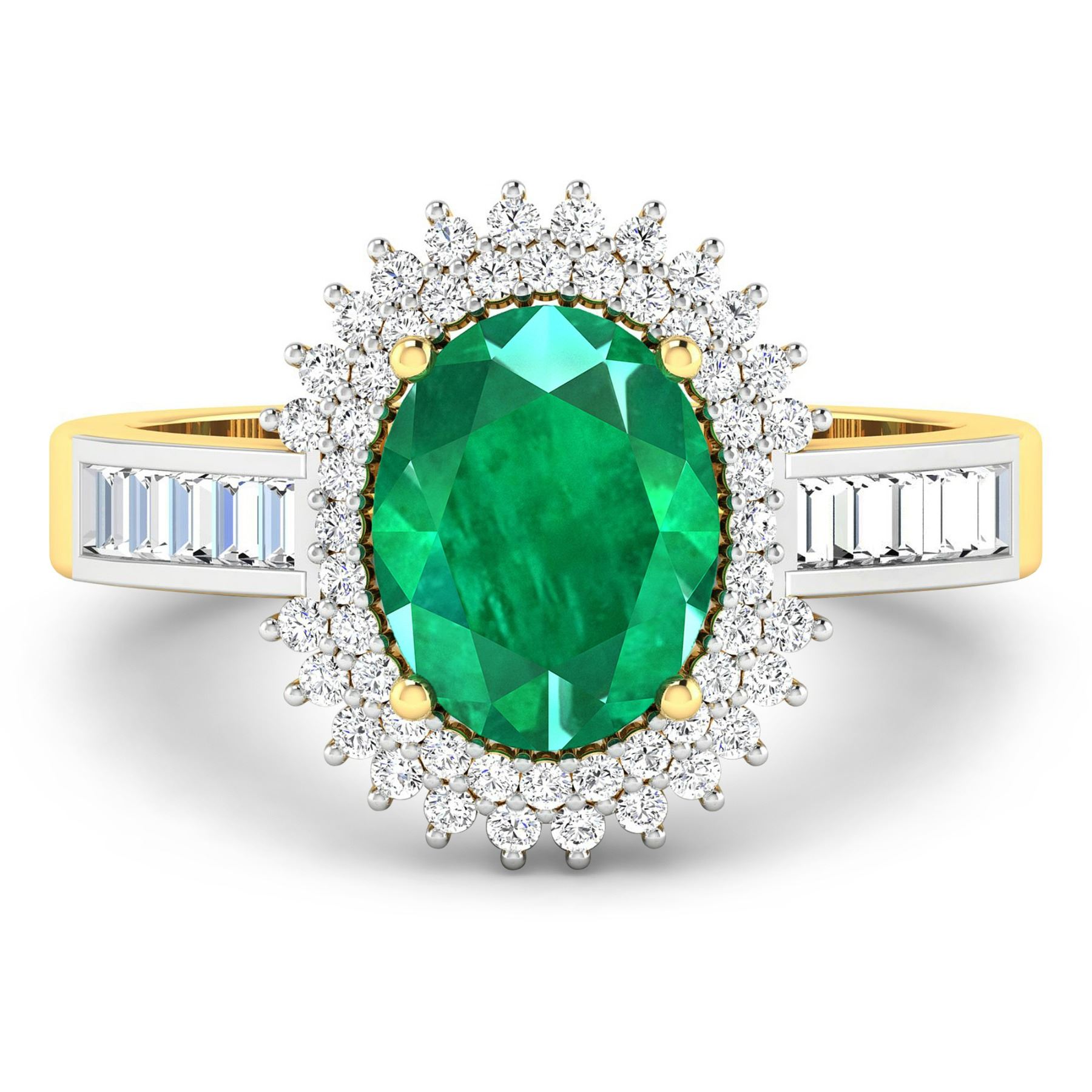 Zambian Emerald (AA) Oval 9x7mm - 1Pc + White Diamond Baguette 2.00x1.50mm - 10Pcs + White Diamond F/C Round 1.00mm - 52Pcs ( White Pan Rhodium ) ( SI-2/HI ) Total weight of gemstone is 1.53cts. Total Diamond weight is 0.52cts. Total weight of this ring is 3.5 grams. Ring size 7.
