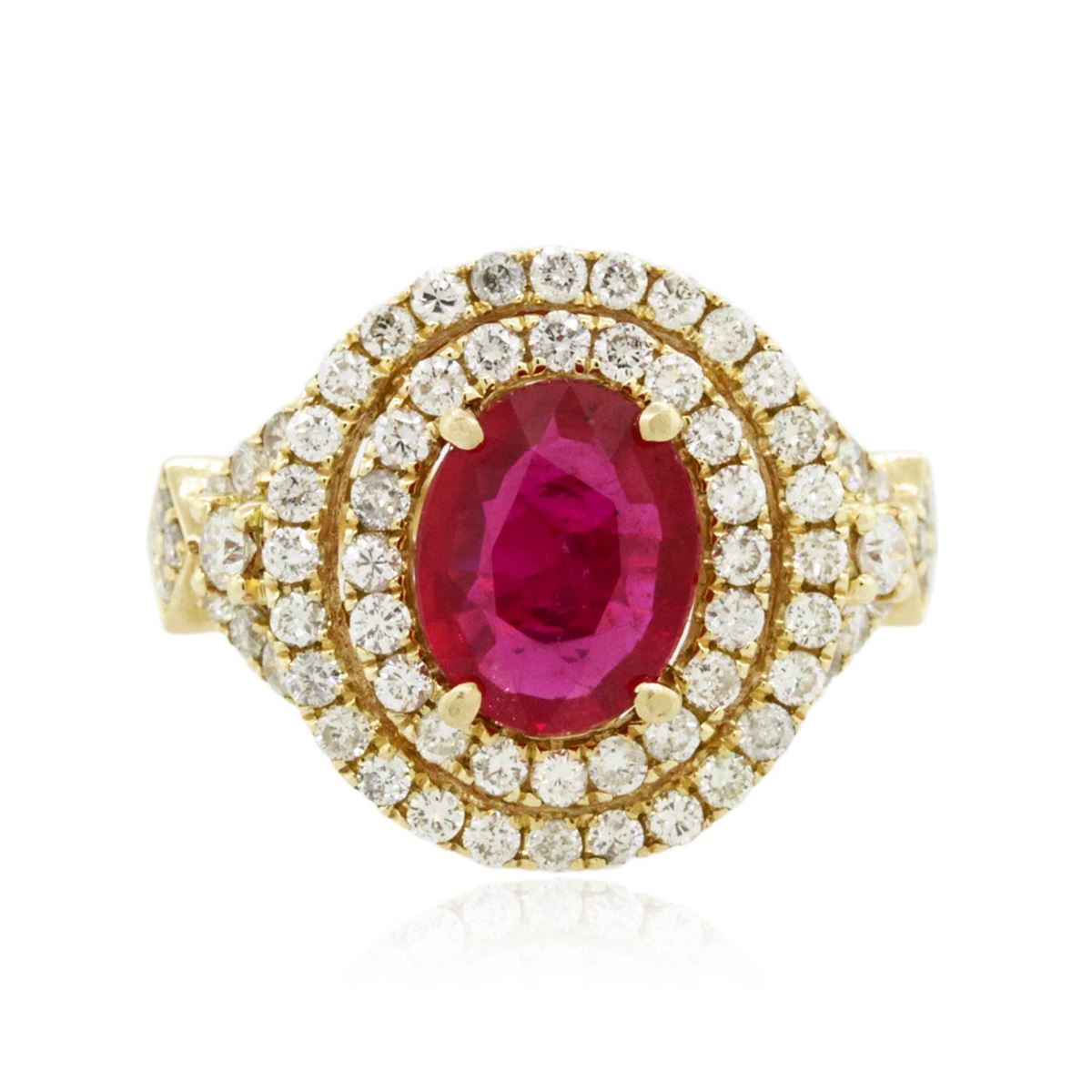 One electronically tested 14KT yellow gold Ladies combination cast & assembled ring with a bright polish finish. Condition is new. Identified with markings of "14K". Containing: One prong set oval modified brilliant cut natural ruby, measuring 9.40 x 7.50 x 2.70mm, approximate weight of 1.54ct., clarity is moderately included, type II, medium dark, moderately strong, strongly purplish red color, (GIA stpR 6/4), cut is good. Colored gemstones are presumed to have been subjected to commonly used color/clarity enhancement processes. Sixty-Eight prong set round brilliant cut diamonds, measuring 1.40 - 1.40 x 0.84mm (depth est.) approximate. Total Weight of 68 Stones = 0.68ct. Clarity: I-1 to I-2. Color: I - J, Cut is Good. Two prong set round brilliant cut diamonds, measuring 2.00 - 2.00 x 1.20mm (depth est.) approximate. Total Weight of 2 Stones = 0.06ct. Clarity: SI-1 to SI-2. Color: I - J, Cut is Good. Total Weight of Colored Stones 1.54ct. Total Weight of Diamonds 0.74ct. Total Weight of Ring 5.50 grams. GGL Appraised at $4,110.00.