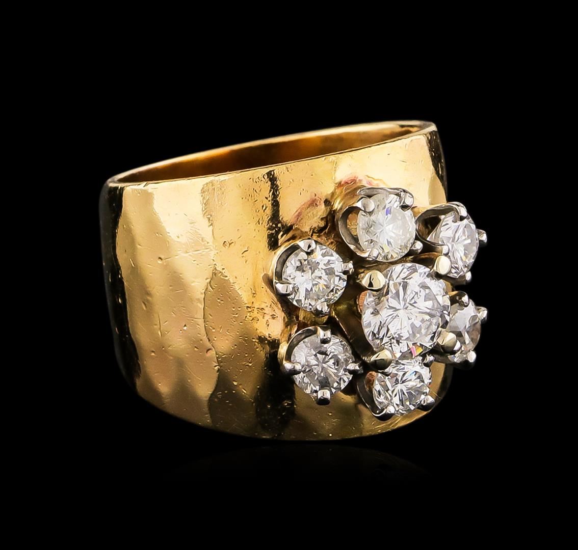 One electronically tested 14KT yellow gold Ladies combination cast & assembled ring with a bright polish finish. Condition is very good. Containing: One prong set round brilliant cut diamond, measuring 5.50 - 5.50 x 3.30mm (depth est.) approximate weight of 0.61ct. Clarity: I-1. Color: J, Cut is Good. Six prong set round brilliant cut diamonds, measuring 3.50 - 3.50 x 2.10mm (depth est.) approximate. Total Weight of 6 Stones = 0.94ct. Clarity: SI-2 to I-1. Color: I - J, Cut is Good. All diamonds are graded in the mounting, unless otherwise stated. Total Weight of Diamonds 1.55ct. Total Weight of Ring 13.40 grams. GGL Appraised at $7,700.00.