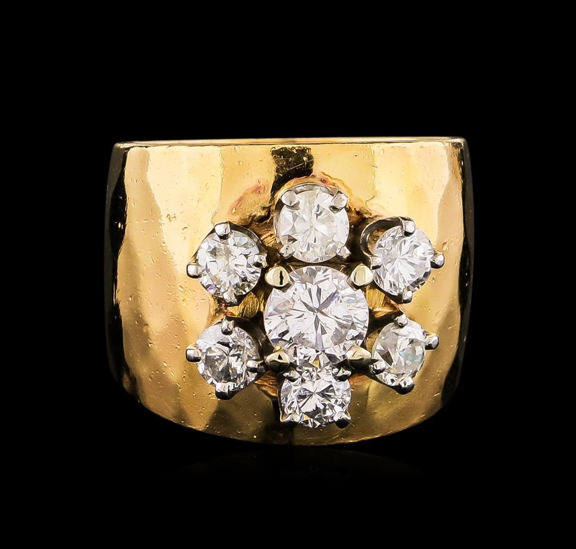 One electronically tested 14KT yellow gold Ladies combination cast & assembled ring with a bright polish finish. Condition is very good. Containing: One prong set round brilliant cut diamond, measuring 5.50 - 5.50 x 3.30mm (depth est.) approximate weight of 0.61ct. Clarity: I-1. Color: J, Cut is Good. Six prong set round brilliant cut diamonds, measuring 3.50 - 3.50 x 2.10mm (depth est.) approximate. Total Weight of 6 Stones = 0.94ct. Clarity: SI-2 to I-1. Color: I - J, Cut is Good. All diamonds are graded in the mounting, unless otherwise stated. Total Weight of Diamonds 1.55ct. Total Weight of Ring 13.40 grams. GGL Appraised.