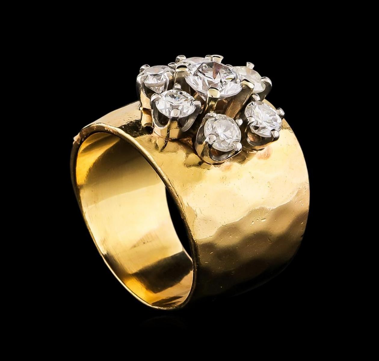 One electronically tested 14KT yellow gold Ladies combination cast & assembled ring with a bright polish finish. Condition is very good. Containing: One prong set round brilliant cut diamond, measuring 5.50 - 5.50 x 3.30mm (depth est.) approximate weight of 0.61ct. Clarity: I-1. Color: J, Cut is Good. Six prong set round brilliant cut diamonds, measuring 3.50 - 3.50 x 2.10mm (depth est.) approximate. Total Weight of 6 Stones = 0.94ct. Clarity: SI-2 to I-1. Color: I - J, Cut is Good. All diamonds are graded in the mounting, unless otherwise stated. Total Weight of Diamonds 1.55ct. Total Weight of Ring 13.40 grams. GGL Appraised.
