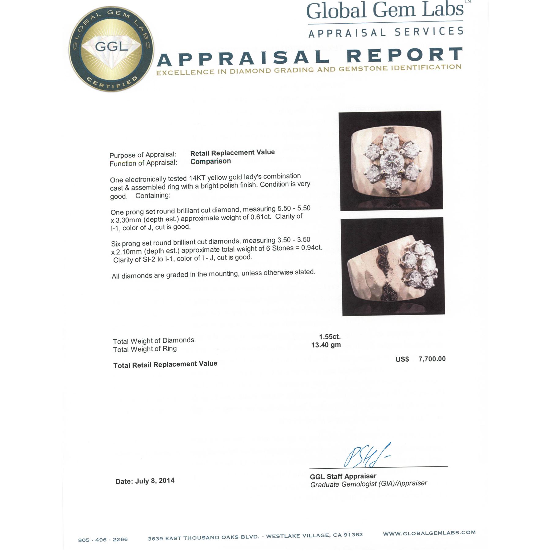One electronically tested 14KT yellow gold Ladies combination cast & assembled ring with a bright polish finish. Condition is very good. Containing: One prong set round brilliant cut diamond, measuring 5.50 - 5.50 x 3.30mm (depth est.) approximate weight of 0.61ct. Clarity: I-1. Color: J, Cut is Good. Six prong set round brilliant cut diamonds, measuring 3.50 - 3.50 x 2.10mm (depth est.) approximate. Total Weight of 6 Stones = 0.94ct. Clarity: SI-2 to I-1. Color: I - J, Cut is Good. All diamonds are graded in the mounting, unless otherwise stated. Total Weight of Diamonds 1.55ct. Total Weight of Ring 13.40 grams. GGL Appraised.