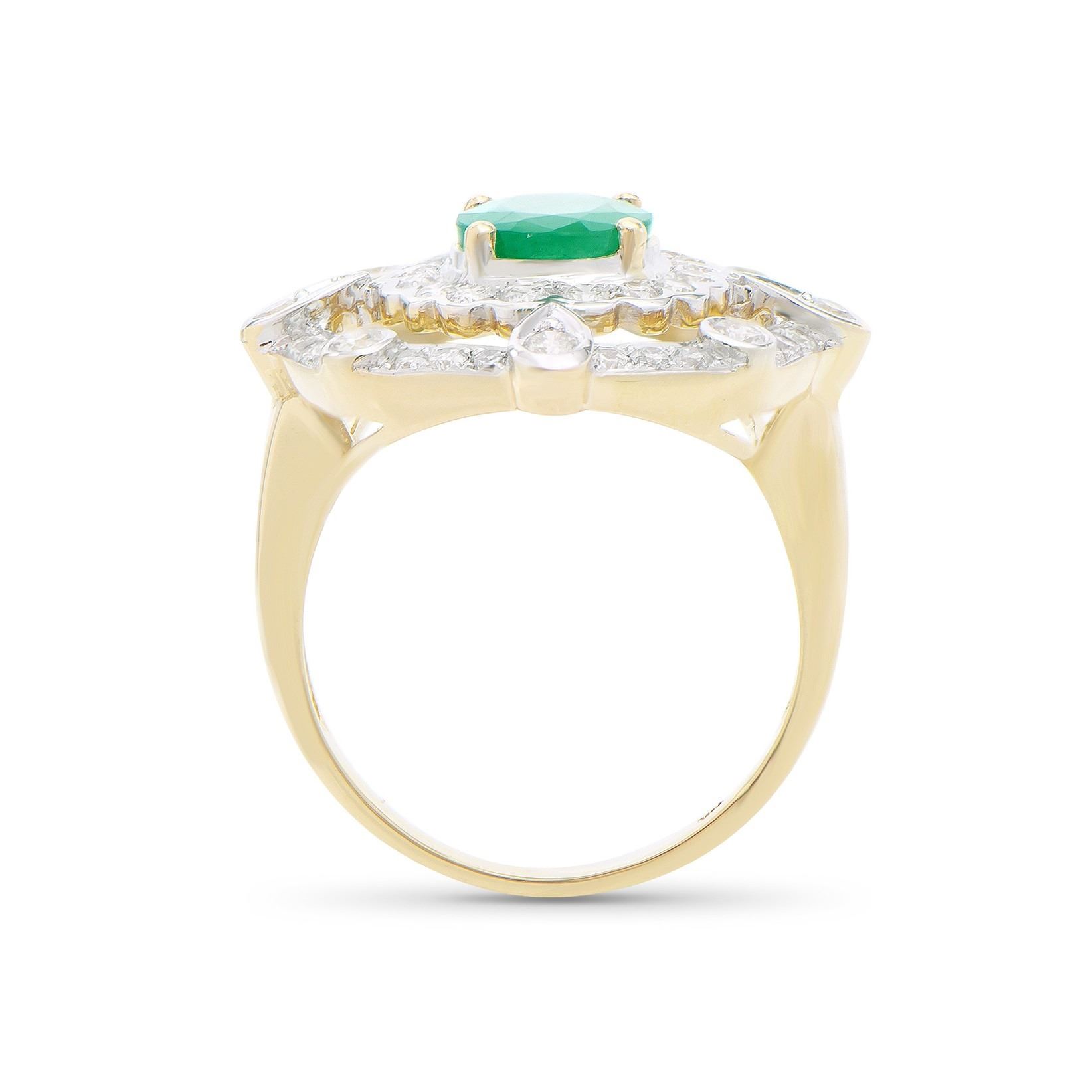 (1) Emerald with a total weight of 1.55cts. (50) round Diamonds with a total weight of 1.02cts with a color of H-I and clarity of I2-I3. Total weight of the ring is 4.60 grams. Ring size 7.5.