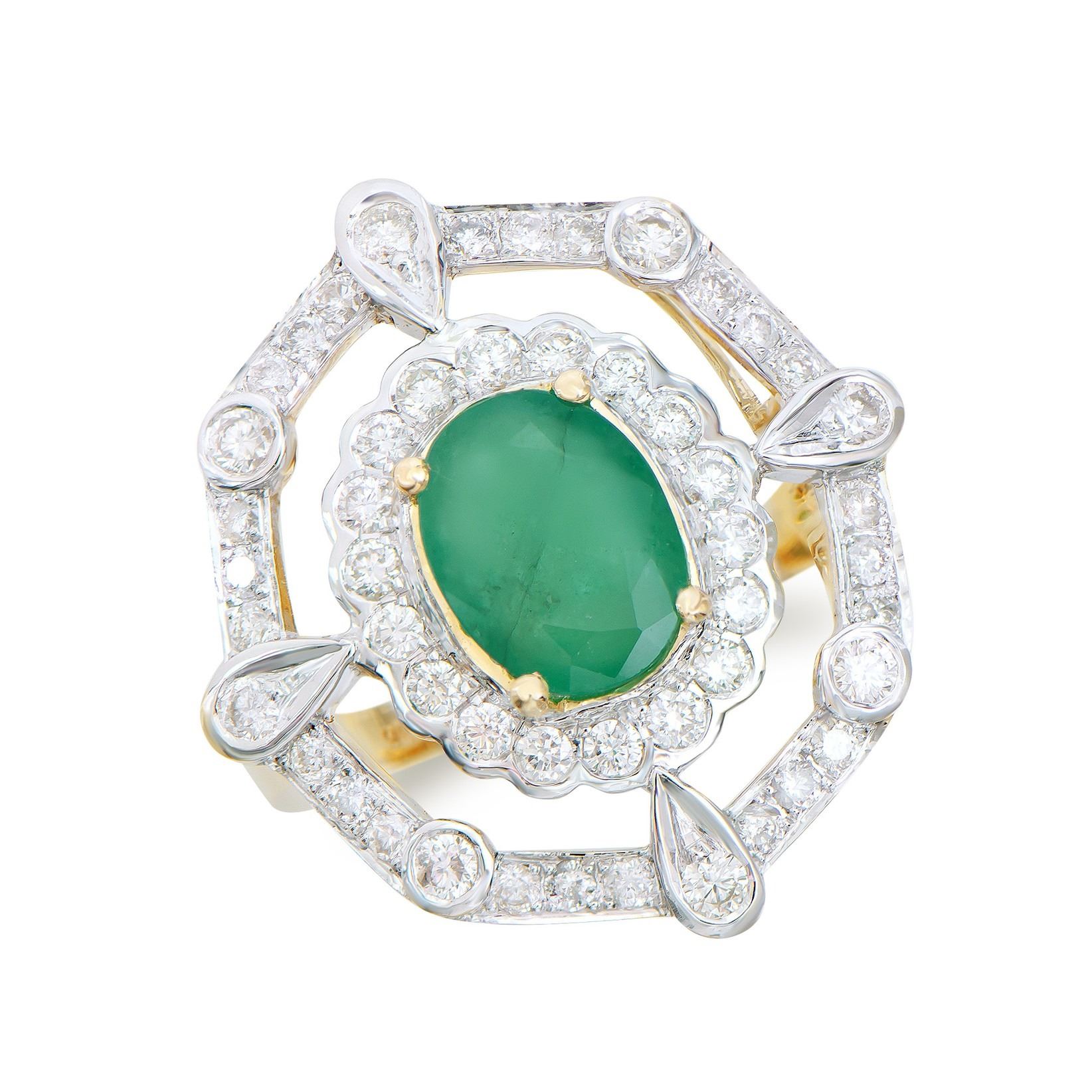 (1) Emerald with a total weight of 1.55cts. (50) round Diamonds with a total weight of 1.02cts with a color of H-I and clarity of I2-I3. Total weight of the ring is 4.60 grams. Ring size 7.5.