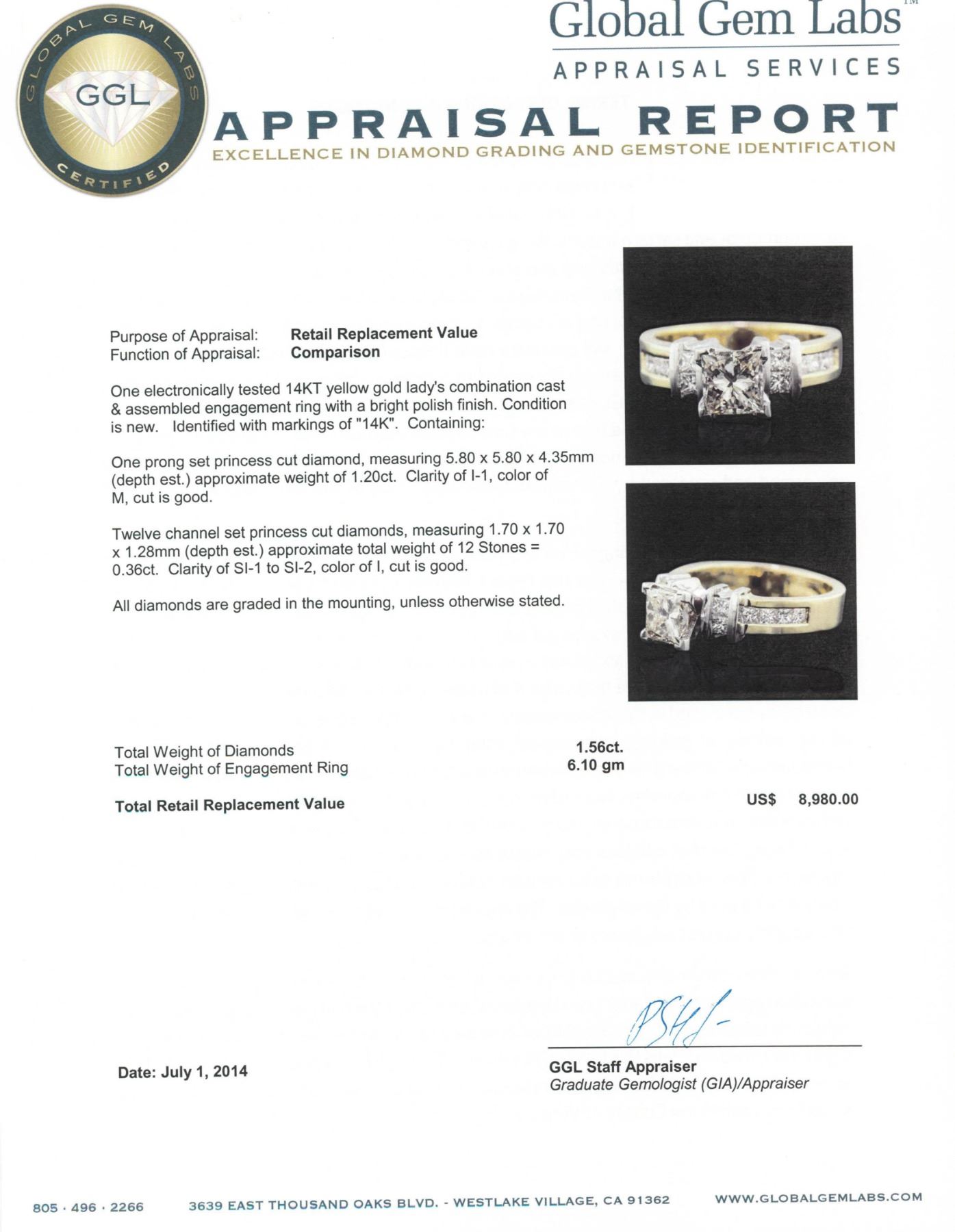 One electronically tested 14KT yellow gold Ladies combination cast & assembled engagement ring with a bright polish finish. Condition is new. Identified with markings of "14K". Containing: One prong set princess cut diamond, measuring 5.80 x 5.80 x 4.35mm (depth est.) approximate weight of 1.20ct. Clarity: I-1. Color: M, Cut is Good. Twelve channel set princess cut diamonds, measuring 1.70 x 1.70 x 1.28mm (depth est.) approximate total weight of 12 Stones = 0.36ct. Clarity: SI-1 to SI-2. Color: I, Cut is Good. All diamonds are graded in the mounting, unless otherwise stated. Total Weight of Diamonds 1.56ct. Total Weight of Engagement Ring 6.10 grams. GGL Appraised at $8,980.00.