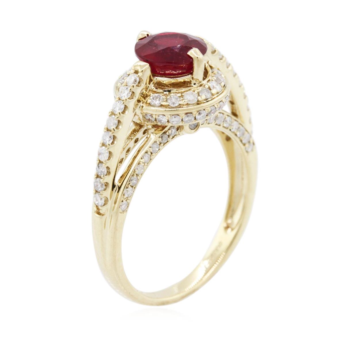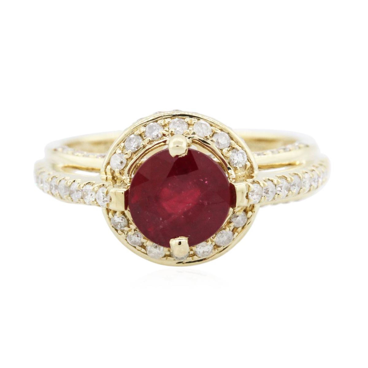 One electronically tested 14KT yellow gold ladies combination cast & assembled ruby and diamond ring with a flat shank with a bright polish finish. Identified with markings of "14K". Condition is new. Containing: One prong set round modified brilliant cut natural ruby, measuring 6.88 - 6.88 x 4.08 mm, approximate weight of 1.56ct., clarity is heavily included, type II, medium dark, moderately strong, red color, (GIA R 6/4), cut is good. Eighty-Eight prong set round brilliant cut diamonds, measuring 1.30 - 1.30 x 0.78mm (depth est.) approximate total weight of 88 Stones = 0.70ct. Clarity: I-1 to I-2. Color: I - J, Cut is Good. Colored gemstones are presumed to have been subjected to commonly used enhancement processes. All diamonds and colored gemstones are graded in the mounting, unless otherwise stated. Total Weight of Colored Stones 1.56ct. Total Weight of Diamonds 0.70ct. Total Weight of Ring 4.70 grams. GGL Appraised at $4,070.00.