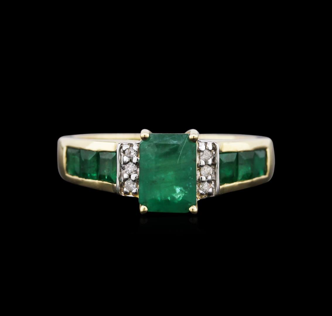 One ring featuring: 14KT yellow gold weighing 2.50 grams containing one emerald center stone with a total weight of 0.96ct, six emeralds with a total weight of 0.60ct and six round diamonds with a total weight of 0.03ct.