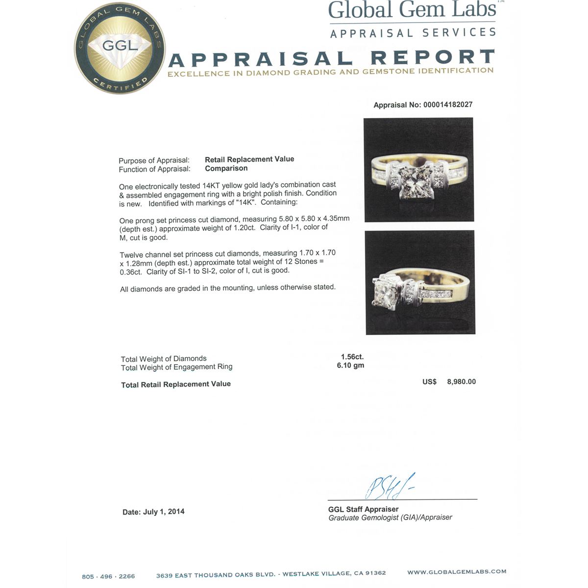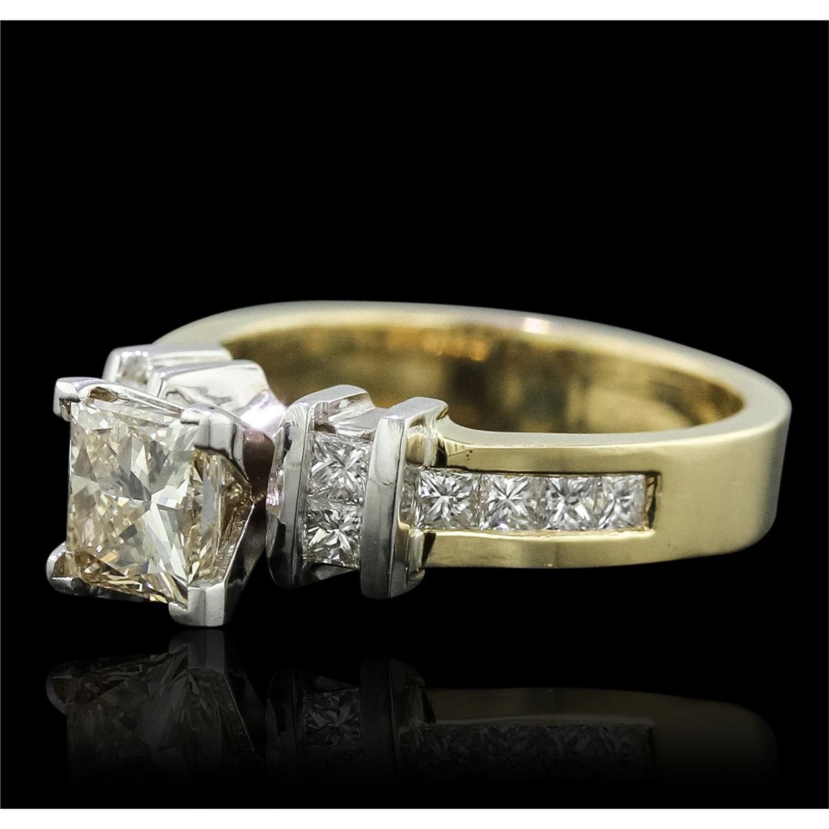 One electronically tested 14KT yellow gold Ladies combination cast & assembled engagement ring with a bright polish finish. Condition is new. Identified with markings of "14K". Containing: One prong set princess cut diamond, measuring 5.80 x 5.80 x 4.35mm (depth est.) approximate weight of 1.20ct. Clarity: I-1. Color: M, Cut is Good. Twelve channel set princess cut diamonds, measuring 1.70 x 1.70 x 1.28mm (depth est.) approximate total weight of 12 Stones = 0.36ct. Clarity: SI-1 to SI-2. Color: I, Cut is Good. All diamonds are graded in the mounting, unless otherwise stated. Total Weight of Diamonds 1.56ct. Total Weight of Engagement Ring 6.10 grams. GGL Appraised at $8,980.00.
