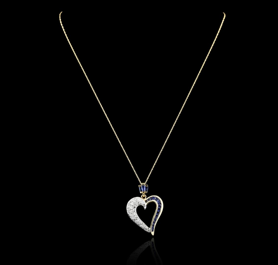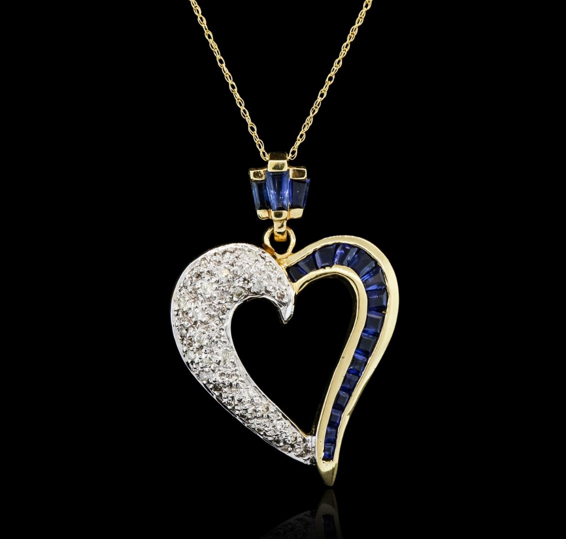 One heart shape pendant with chain featuring: 14KT yellow gold weighing 8.00 grams containing sapphires with a total weight of 1.56cts and round diamonds with a total weight of 0.38cts.