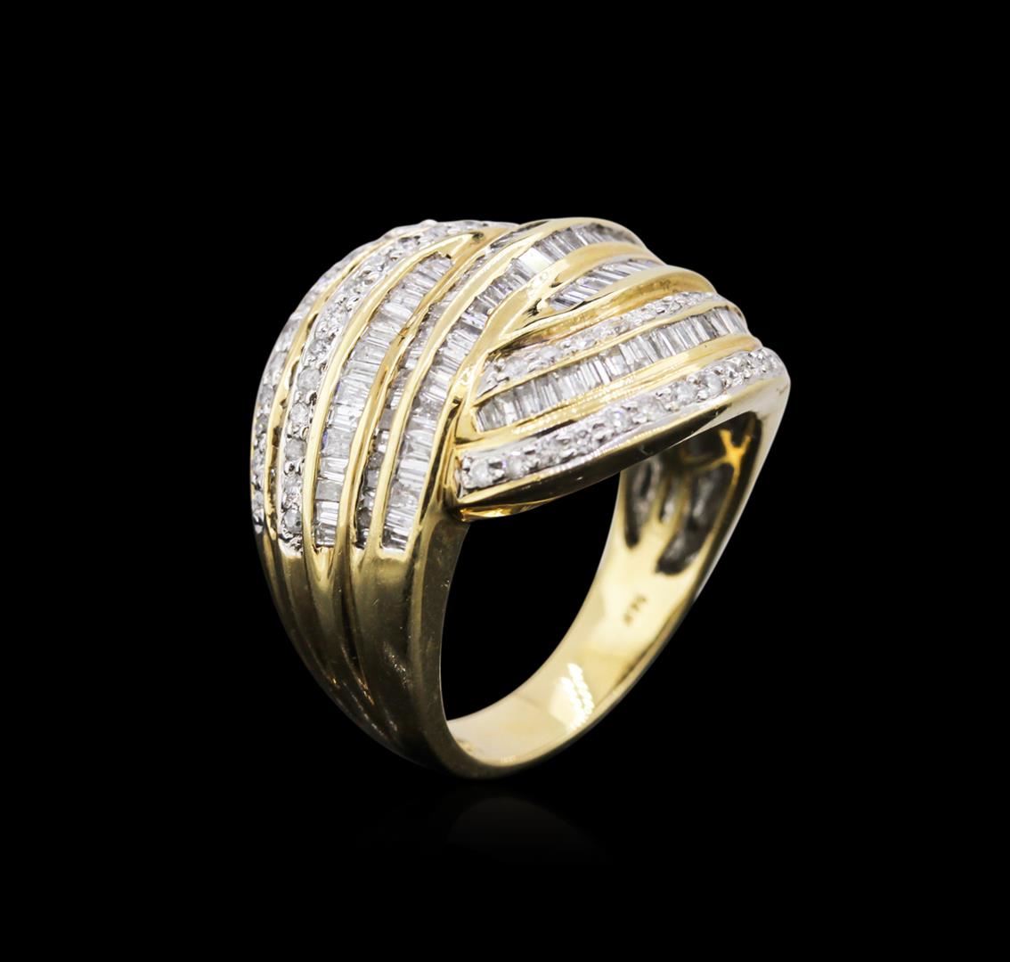 One ring featuring: 14KT yellow gold weighing 6.70 grams containing 134 baguette cut diamonds with a total weight of 1.24ct and 56 round diamonds with a total weight of 0.35ct.