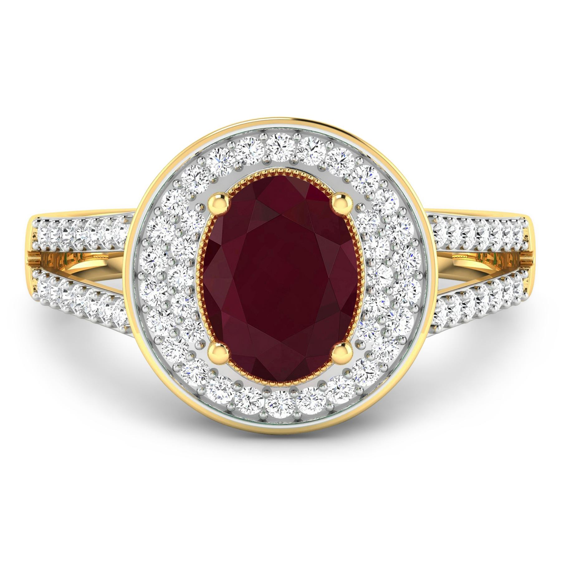 Ruby (AA) Oval 8x6mm - 1Pc + White Diamond F/C Round 1.10mm - 24Pcs + White Diamond F/C Round 1.00mm - 40Pcs ( White Pan Rhodium ) ( I1-I2/I color ) Total weight of gemstone is 1.5cts. Total Diamond weight is 0.34cts. Total weight of this ring is 3.04 grams. Ring size 7.