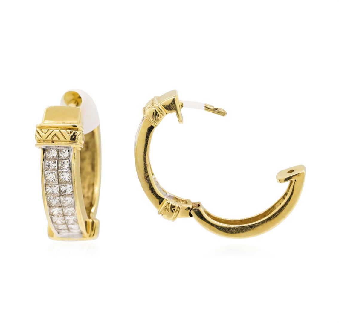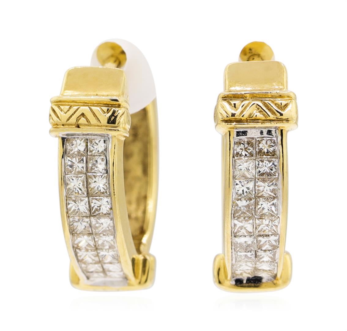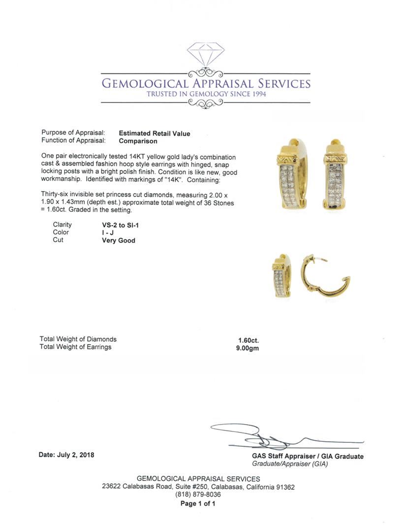One pair electronically tested 14KT yellow gold lady's combination cast & assembled fashion hoop style earrings with hinged, snap locking posts with a bright polish finish. Identified with markings of '14K'. Condition is like new, good workmanship. Containing: Thirty-Six invisible set princess cut diamonds, measuring 2.00 x 1.90 x 1.43mm (depth est.) approximate total weight of 36 Stones = 1.60ct. Graded in the setting. Color I - J Clarity VS-2 to SI-1 Cut Very Good. Total Weight of Diamonds 1.60ct. Total Weight of Earrings 9.00gm. GAS Appraised.