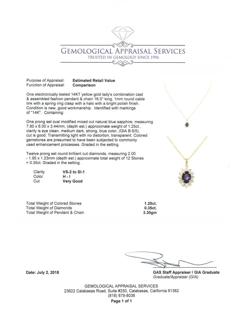 One electronically tested 14KT yellow gold lady's combination cast & assembled fashion pendant & chain 16.0' long, 1mm round cable link with a spring ring clasp with a halo with a bright polish finish. Identified with markings of '14K'. Condition is new, good workmanship. Containing: One prong set oval modified mixed cut natural blue sapphire, measuring 7.80 x 6.00 x 3.44mm, (depth est.) approximate weight of 1.25ct., clarity is eye clean, medium dark, strong, blue color, (GIA B 6/5), cut is good. Transmitting light with no distortion, transparent. Colored gemstones are presumed to have been subjected to commonly used enhancement processes. Graded in the setting. Twelve prong set round brilliant cut diamonds, measuring 2.00 - 1.95 x 1.23mm (depth est.) approximate total weight of 12 Stones = 0.35ct. Graded in the setting. Color H - I Clarity VS-2 to SI-1 Cut Very Good. Total Weight of Colored Stones 1.25ct. Total Weight of Diamonds 0.35ct. Total Weight of Pendant & Chain 3.30gm. GAS Appraised.