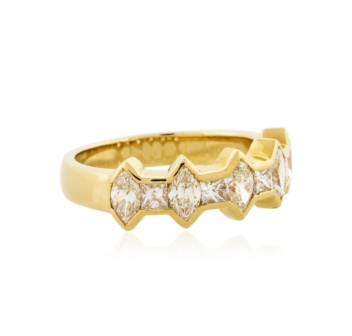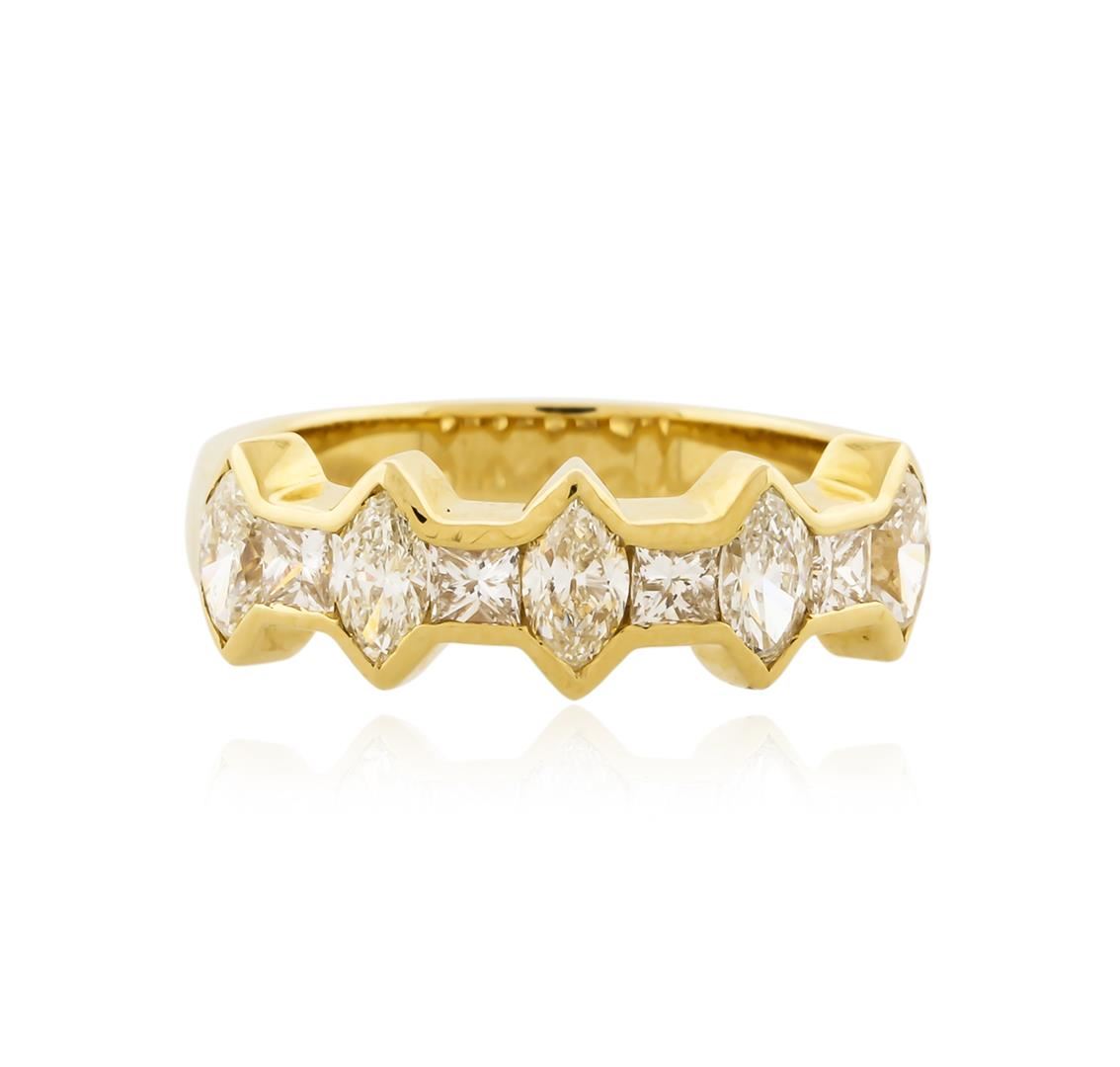 One electronically tested 14KT yellow gold ladies cast diamond ring with a bright polish finish. Identified with markings of "14K". Condition is new. Containing: Five half bezel set marquise shaped cut diamonds, measuring 5.50 x 3.50 x 2.21mm (depth est.) approximate total weight of 5 Stones = 1.23ct. Clarity: SI-1. Color: J - K, Cut is Good. Four channel set princess cut diamonds, measuring 2.50 x 2.50 x 1.88mm (depth est.) approximate total weight of 4 Stones = 0.39ct. Clarity: VS-2 to SI-1. Color: J - K, Cut is Good. All diamonds are graded in the mounting, unless otherwise stated. Total Weight of Diamonds 1.62ct. Total Weight of Ring 5.70 grams. GGL Appraised at $4,995.00.