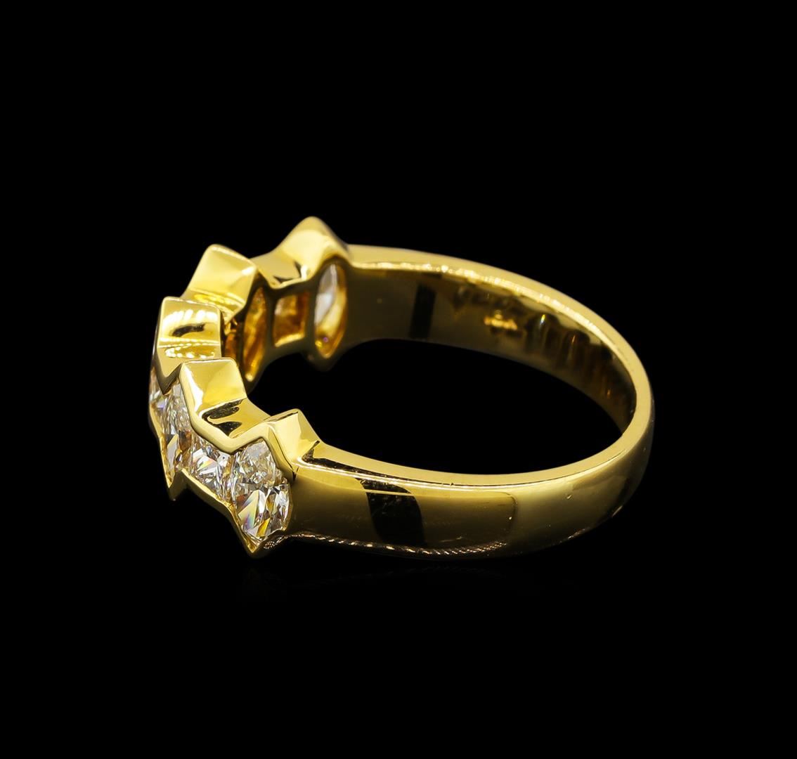 One electronically tested 14KT yellow gold ladies cast diamond ring with a bright polish finish. Identified with markings of "14K". Condition is new. Containing: Five half bezel set marquise shaped cut diamonds, measuring 5.50 x 3.50 x 2.21mm (depth est.) approximate total weight of 5 Stones = 1.23ct. Clarity: SI-1. Color: J - K, Cut is Good. Four channel set princess cut diamonds, measuring 2.50 x 2.50 x 1.88mm (depth est.) approximate total weight of 4 Stones = 0.39ct. Clarity: VS-2 to SI-1. Color: J - K, Cut is Good. All diamonds are graded in the mounting, unless otherwise stated. Total Weight of Diamonds 1.62ct. Total Weight of Ring 5.70 grams. GGL Appraised at $4,995.00.