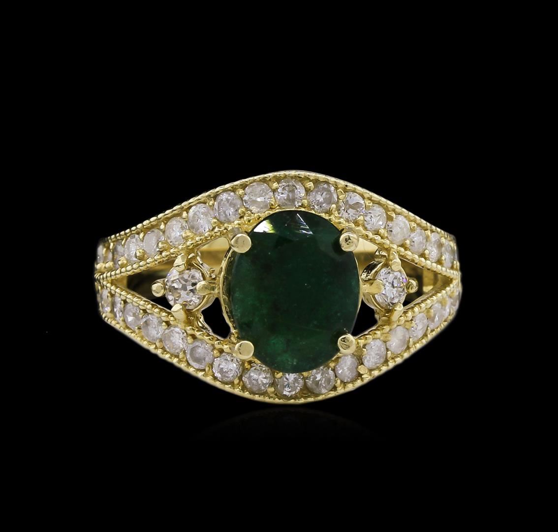 One electronically tested 14KT yellow gold ladies cast emerald and diamond ring. Condition is new, good workmanship. The featured emerald is accented by a single diamond on either side supported by mirroring diamond ribbons, completed by a three millimeter wide band. Bright polish finish with milgrain detailing throughout. Identified with markings of "K14". Containing: One prong set oval mixed cut natural emerald, measuring 8.95 x 7.00 x 4.35mm, 8% bulge factor, approximate weight of 1.63ct, clarity is heavily included, type III, medium dark, moderately strong, very slightly bluish green color, (GIA vslbG 6/4), cut is good. Transmitting light somewhat diffusely, transparent to translucent. Naturally occurring internal & external characteristics are present. Indications of oil residue. Graded in the setting. Two prong set old European & round brilliant cut diamonds, measuring 2.50 x 2.40 x 1.47mm (depth est.) approximate total weight of 2 Stones = 0.16ct. Graded in the setting. Clarity SI-2 Color H - I Thirty-Eight bead set round brilliant cut diamonds, measuring 1.70 - 1.60 x 0.99mm (depth est.) approximate total weight of 38 Stones = 0.72ct. Graded in the setting. Clarity I-1 to I-3 Color H - J Total Weight of Colored Stones 1.63ct. Total Weight of Diamonds 0.88ct. Total Weight of Ring 5.91 grams. AIG Appraised at $3,830.00.