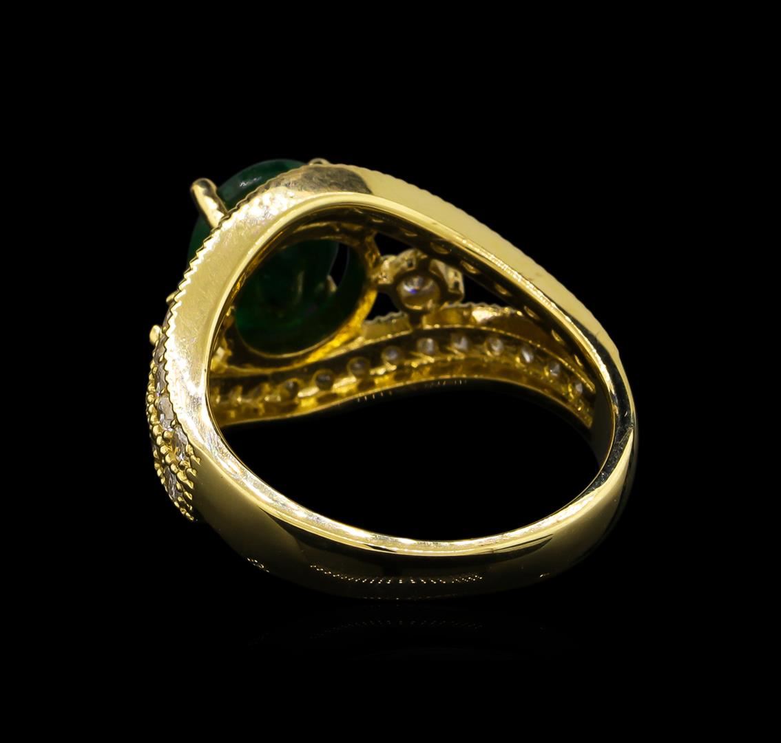 One electronically tested 14KT yellow gold ladies cast emerald and diamond ring. Condition is new, good workmanship. The featured emerald is accented by a single diamond on either side supported by mirroring diamond ribbons, completed by a three millimeter wide band. Bright polish finish with milgrain detailing throughout. Identified with markings of "K14". Containing: One prong set oval mixed cut natural emerald, measuring 8.95 x 7.00 x 4.35mm, 8% bulge factor, approximate weight of 1.63ct, clarity is heavily included, type III, medium dark, moderately strong, very slightly bluish green color, (GIA vslbG 6/4), cut is good. Transmitting light somewhat diffusely, transparent to translucent. Naturally occurring internal & external characteristics are present. Indications of oil residue. Graded in the setting. Two prong set old European & round brilliant cut diamonds, measuring 2.50 x 2.40 x 1.47mm (depth est.) approximate total weight of 2 Stones = 0.16ct. Graded in the setting. Clarity SI-2 Color H - I Thirty-Eight bead set round brilliant cut diamonds, measuring 1.70 - 1.60 x 0.99mm (depth est.) approximate total weight of 38 Stones = 0.72ct. Graded in the setting. Clarity I-1 to I-3 Color H - J Total Weight of Colored Stones 1.63ct. Total Weight of Diamonds 0.88ct. Total Weight of Ring 5.91 grams. AIG Appraised at $3,830.00.
